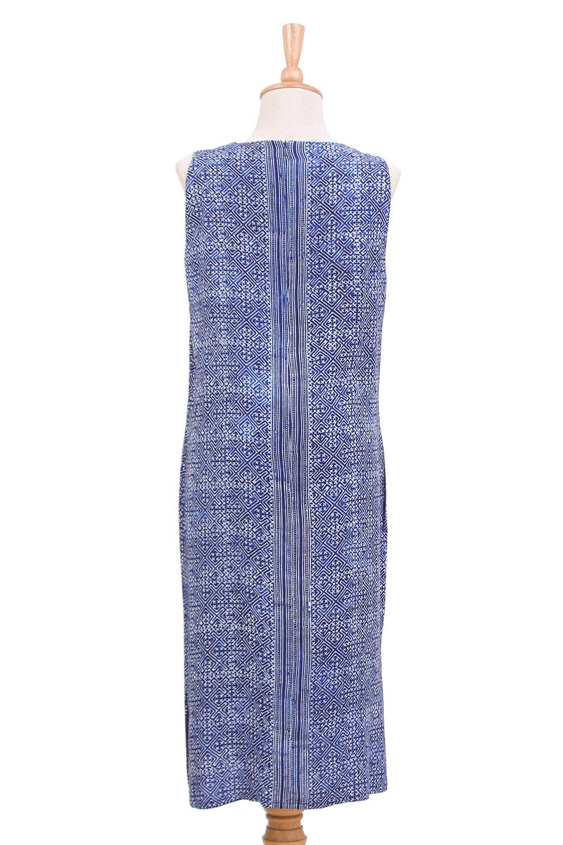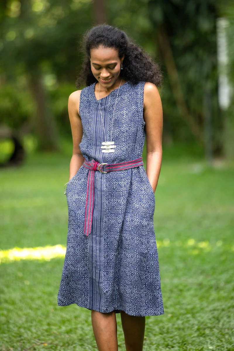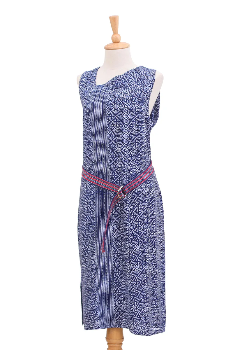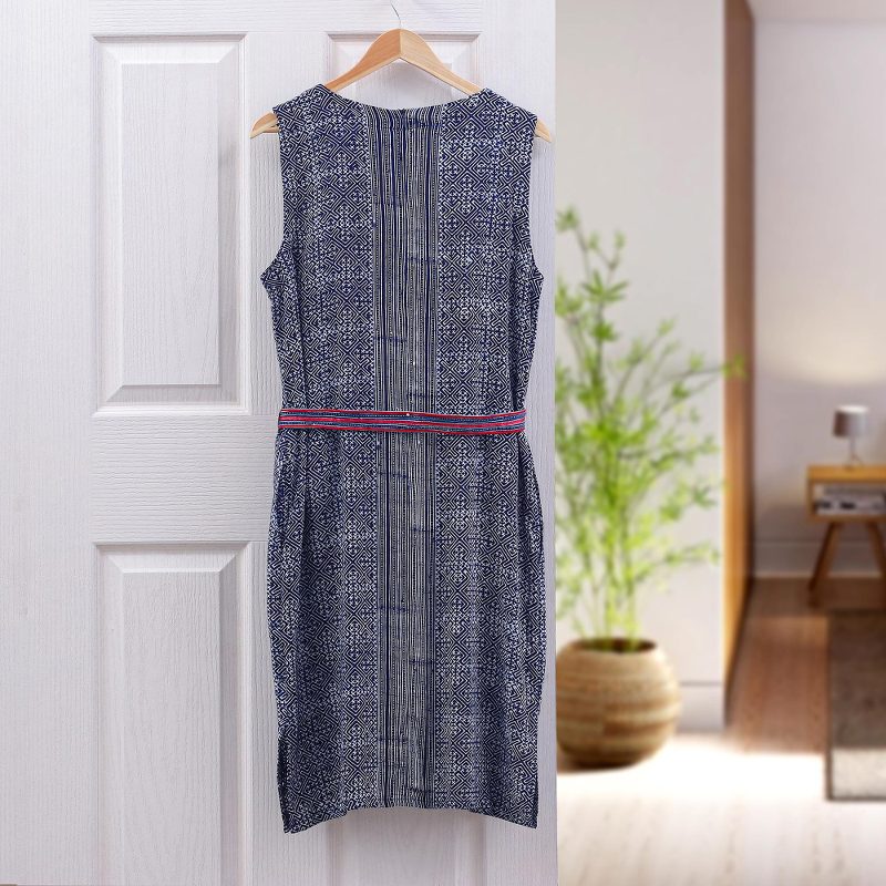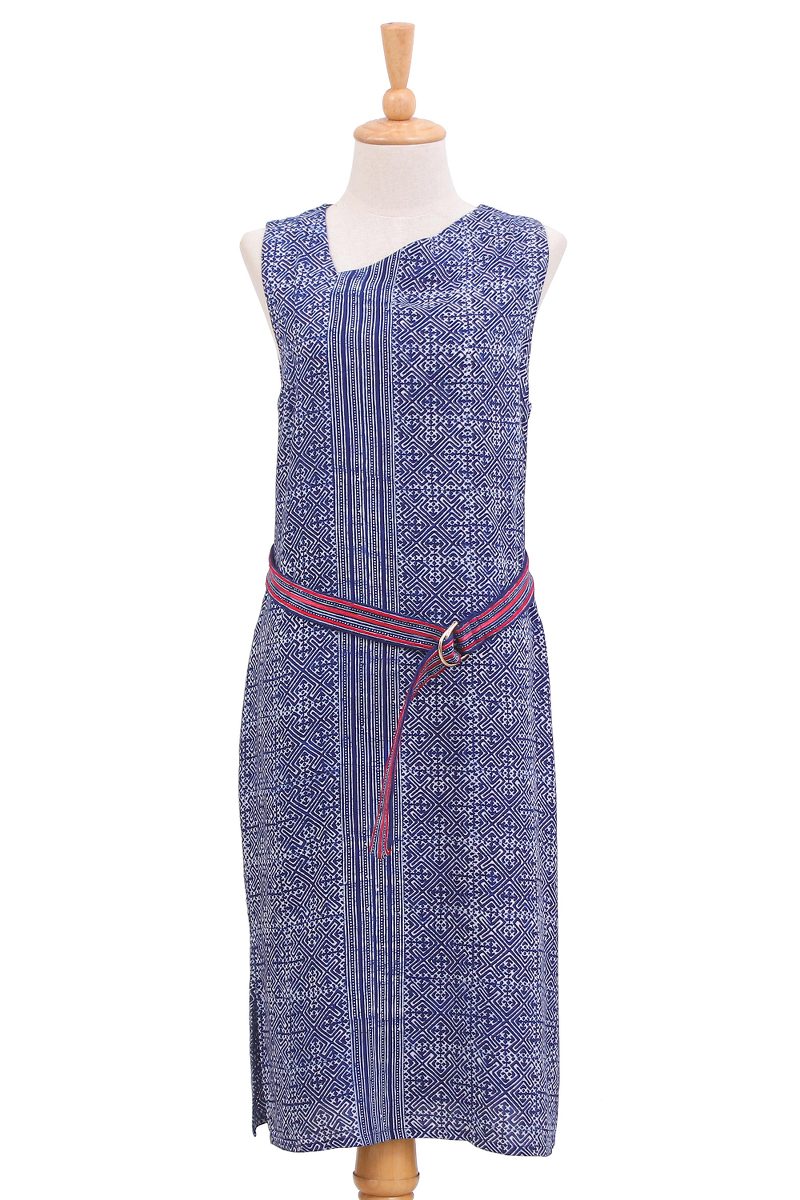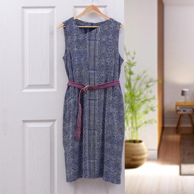 Considered masters at creating intricate batik designs, the Hmong people of South East Asia developed the resist dyeing process as a form of communication through symbols. Designed by Thailand's Pimpun, this cotton sheath dress features a traditional indigo batik print, two slit pockets, and a removable belt.