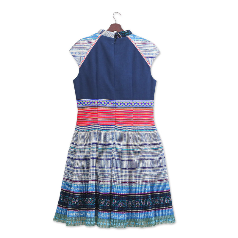 Backed by our 100% Happiness GuaranteeThe Hmong Hill Tribe culture illustrates its love for nature in different accessories proudly worn by its people. With a gorgeous blue shade embellishing the cotton and hemp bodice, this exquisite A-line dress by Thai artisan Chattima features traditional Hmong textiles on the capped sleeves, neckline and pleated skirt. The diverse classic floral motifs are made using a combination of cross-stitch and printed techniques. Each dress is a one off limited edition using unique vintage fabrics.