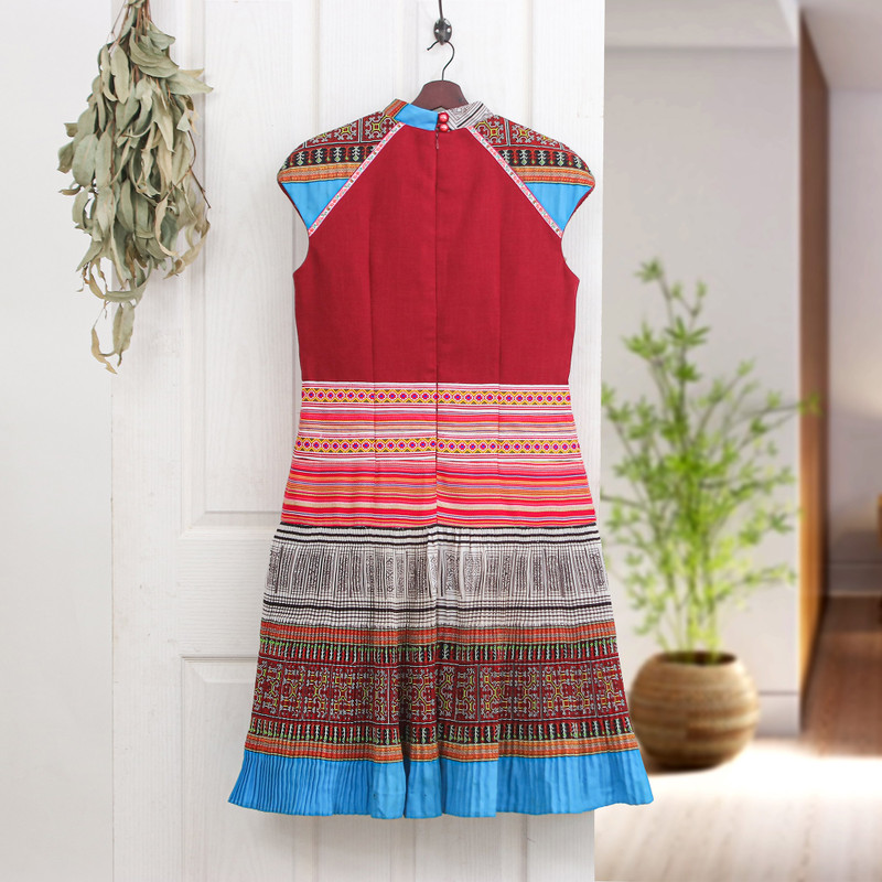 Backed by our Happiness GuaranteeThe traditional Hmong textiles and motifs exquisitely displayed in this sheath dress's short sleeves, crew neckline and pleated skirt epitomize elegance and craftsmanship. Crafted with meticulous care from a seamless fusion of cotton and hemp, the top in an energizing red shade is enhanced by a gorgeous rayon panel positioned just below that complements it perfectly. Imbued with alluring patterns created using a blend of cross-stitch and printed methods, this fully-lined dress by Thai artisan Chattima is flawlessly finished with a concealed back zippered closure and nape buttons, guaranteeing an impeccable and tailored fit.
