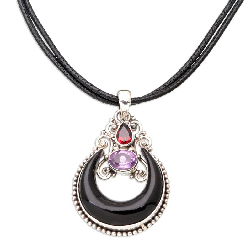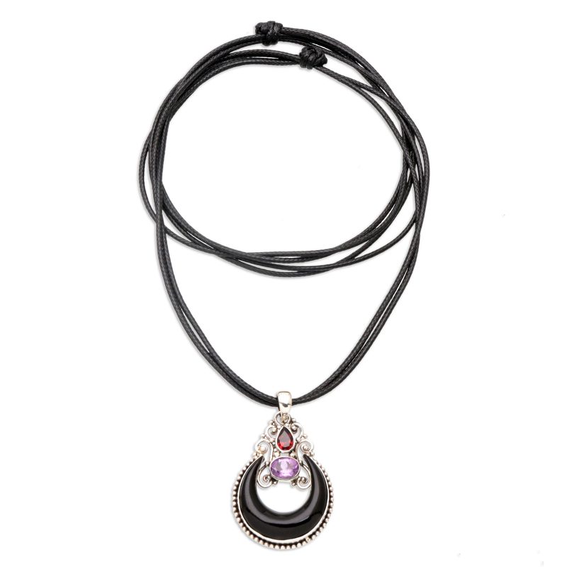 Backed by our 100% Happiness GuaranteeSterling silver accents made with the granulation technique perfected by Balinese silversmiths for centuries frame this stunning moon pendant crafted from hand-carved horn and featuring lustrous amethyst and garnet gemstones. The exquisite pendant necklace comes with an adjustable cotton cord and is a must-have accessory designed by artisan Ayu Ary.