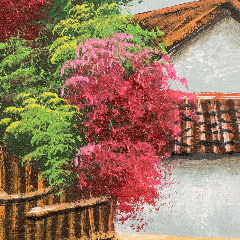 Delivery EstimateGuatemalan artist Hugo Pichiya depicts a corner of the town of Zunil located in his homeland using oil paints on a canvas and the classic Impressionist style. The wonderful composition features numerous small houses that dominate the foreground with the town's church visible in the background. The trees and small fuchsia-colored flowers add a unique touch to the artwork, creating a pleasant and lively atmosphere.