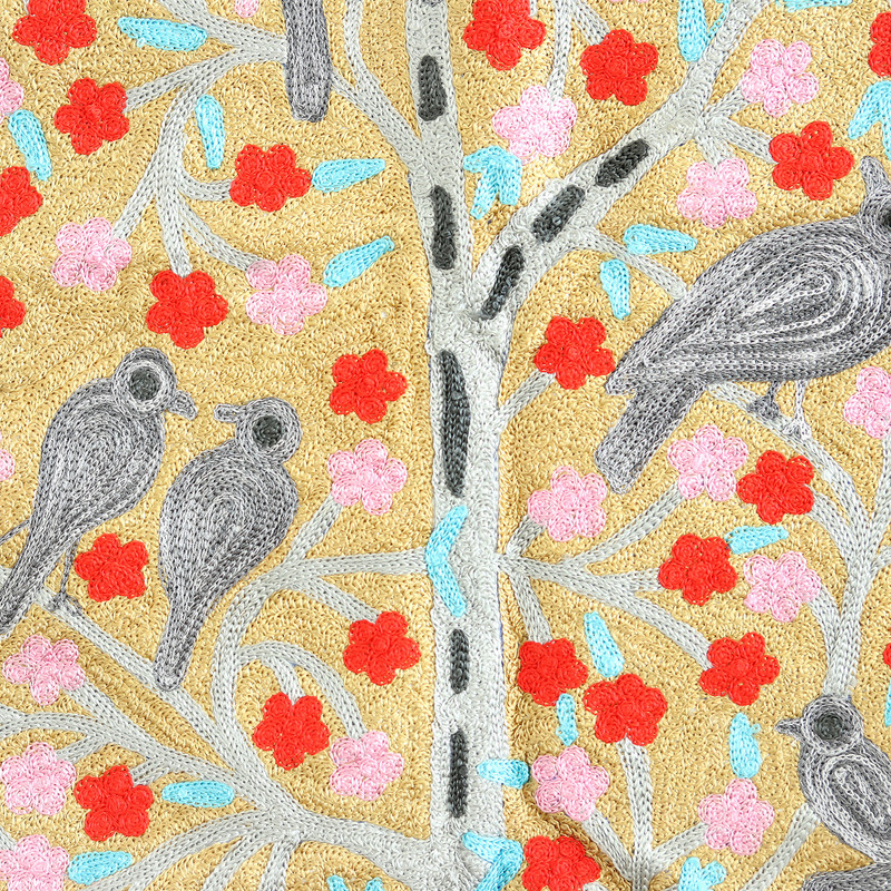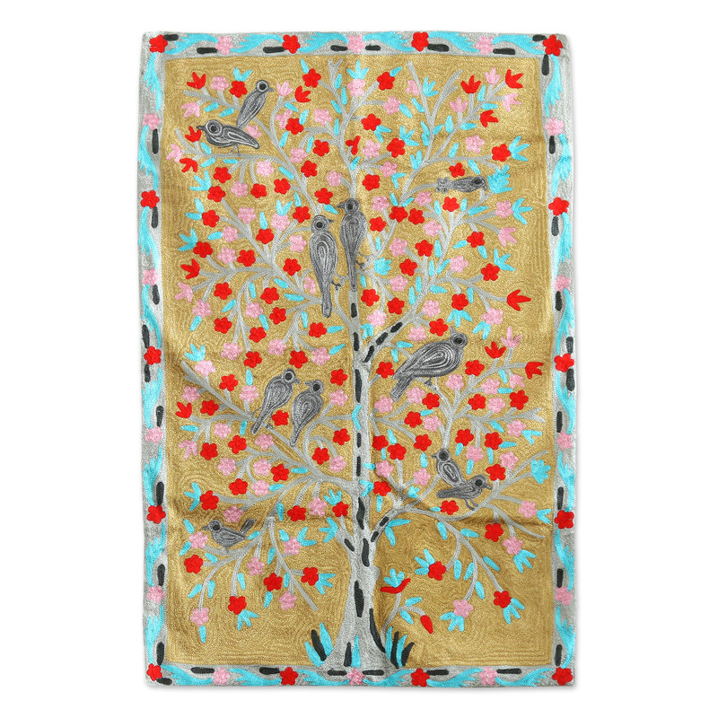 Have a colorful flora and fauna festival at home with this splendid chain-stitched tapestry woven by hand from acrylic yarn on a cotton warp. The striking design by Indian artisan Amit Moza that depicts charming birds resting on a blooming tree will undoubtedly become one of your most precious decorative accents.
