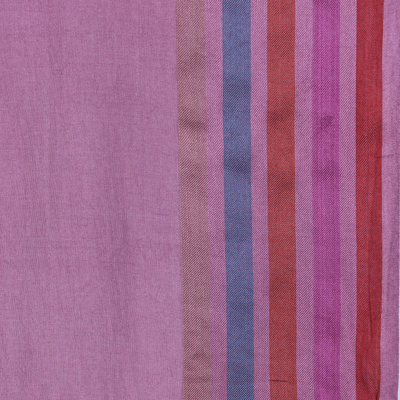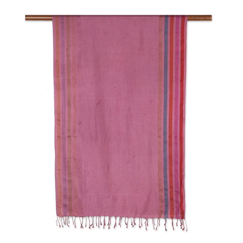 Backed by our Happiness GuaranteeWith a stunning design that complements several styles, this charming silk shawl has a mauve tone enhanced with colorful stripes. Presented by Khitish, this lovely garment is handloomed in India with traditional techniques.