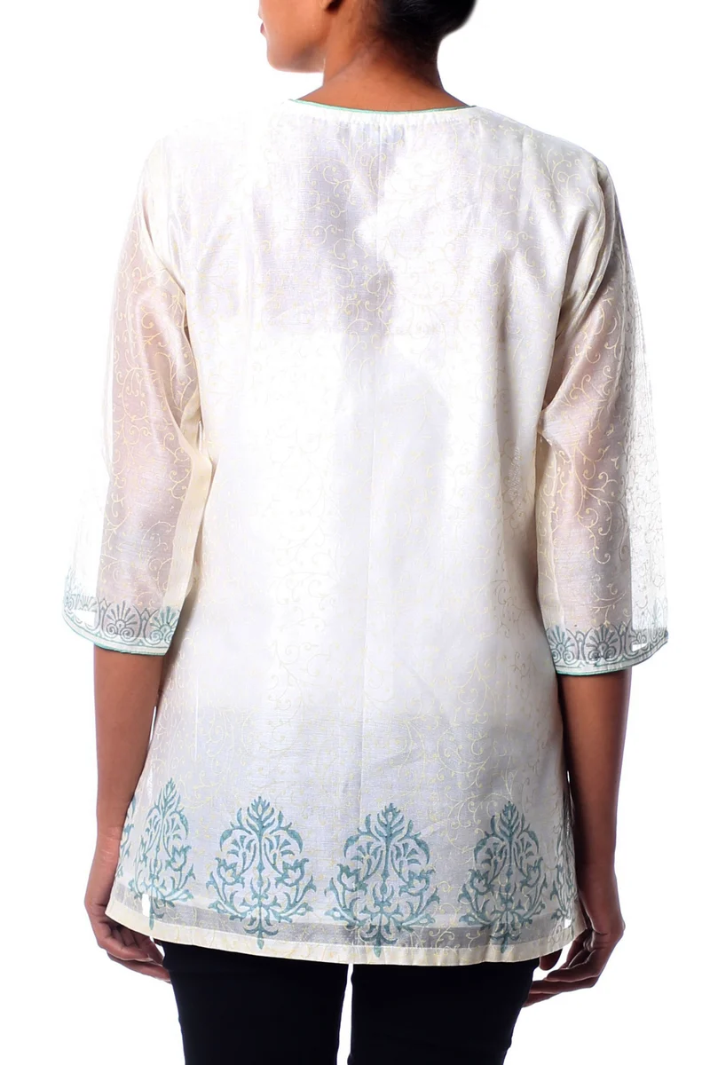 By Isha Jain, this beautiful tunic showcases India's handcrafted block print technique in gold and teal. The top features three quarter sleeves, slits at the sides and a scoop neck with piping. Lined in cotton, it fastens with hidden hooks and eyes.