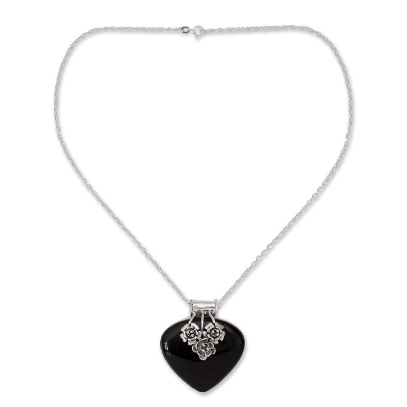 Sweet blossoms flourish on a heart carved from glistening onyx as Neeru Goel declares her love of nature. Featuring sterling silver flowers, the hand crafted pendant swings gracefully from a cable chain.
