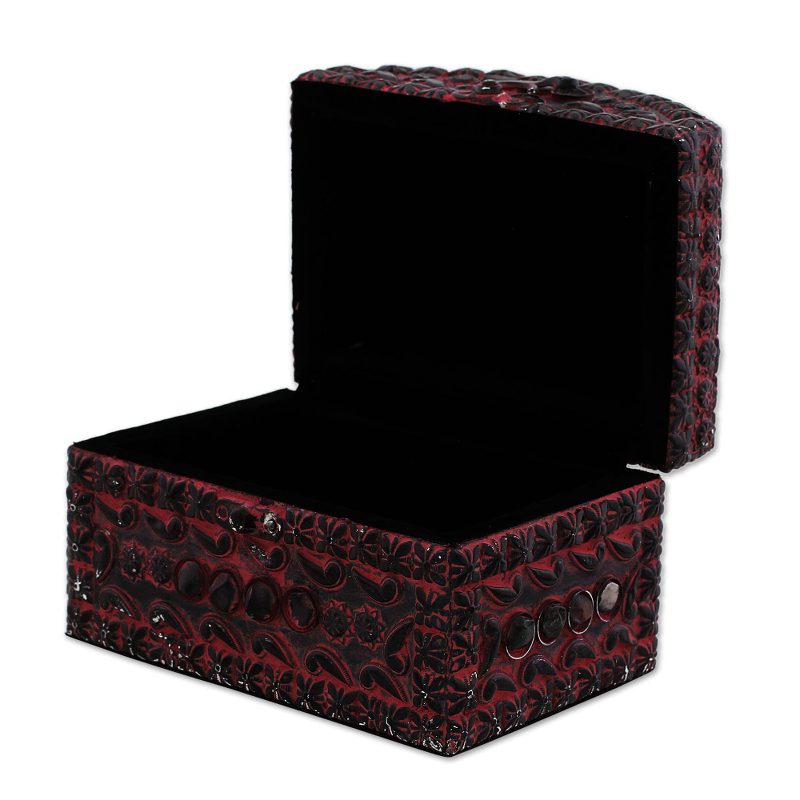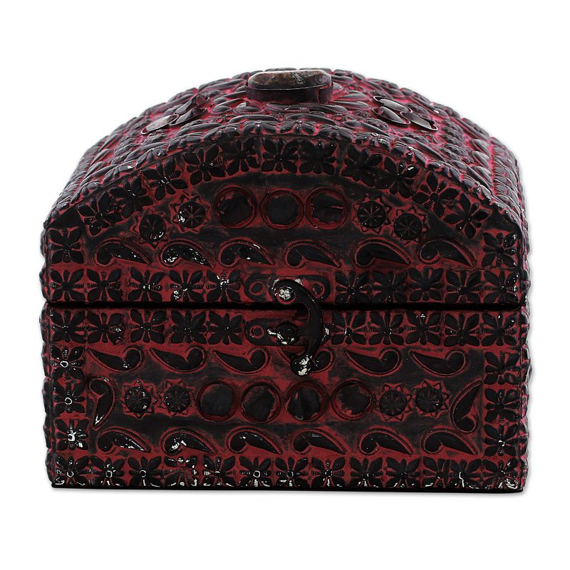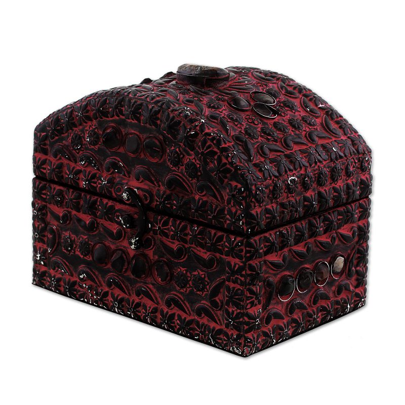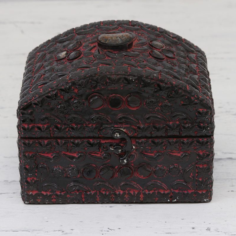 Backed by our 100% Happiness GuaranteeIndian artisan Khalid Ali has created a gorgeous jewelry box in a brilliant pink color. Made of wood, covered with embossed aluminum, and finished with agate stones, this jewelry box captures the beauty of Indian artistry. A black velvet lining ensures that jewelry is protected from scratches, and a velvet bottom protects your furniture. This stunning piece features an aged, antiqued finish and closes via iron hinges and an intricate iron lock.