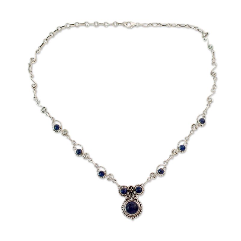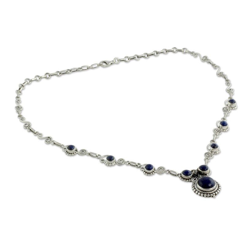 Backed by our 100% Happiness GuaranteeThe September birthstone, lapis lazuli, and its rich blue splendor graces a regal necklace. Neeru Goel demonstrates a contemporary interpretation of India's traditional royal jewelry. Set in sterling silver, cabochon gemstones find the perfect showcase.