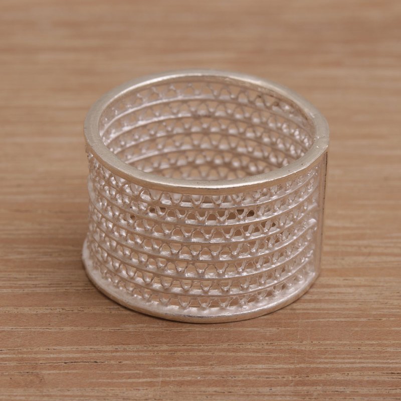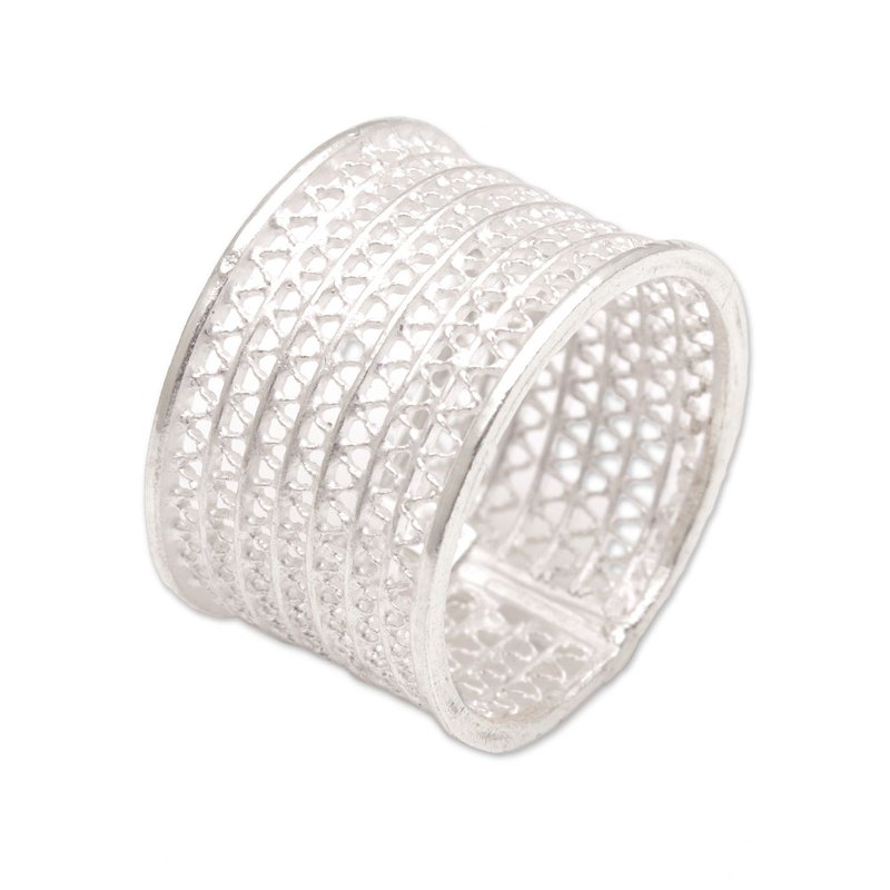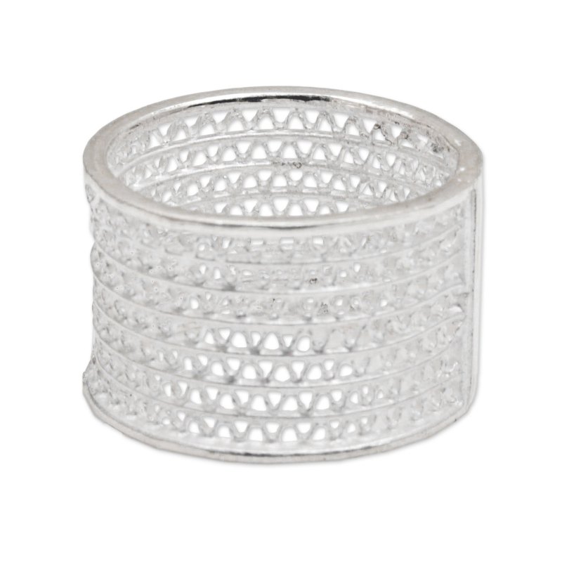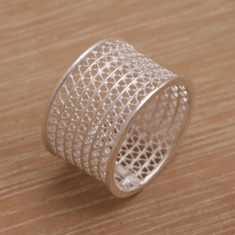 Javanese artisan Antarina crafts this elaborate sterling silver band ring. Multiple rows of intricate open work result in a ring design with the appearance of fine lace. With its width and its high polish finish, the handmade ring makes an eye-catching accessory.