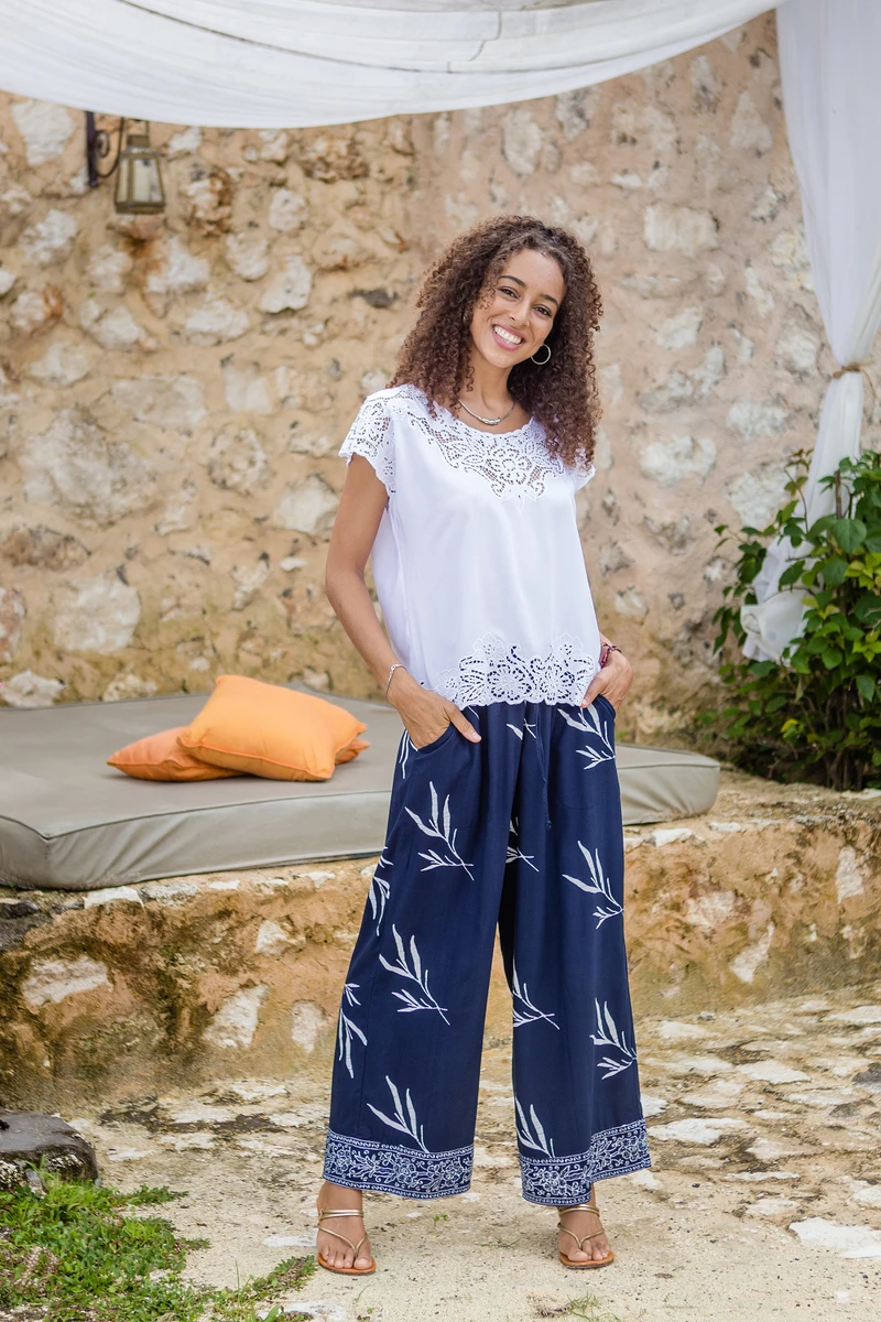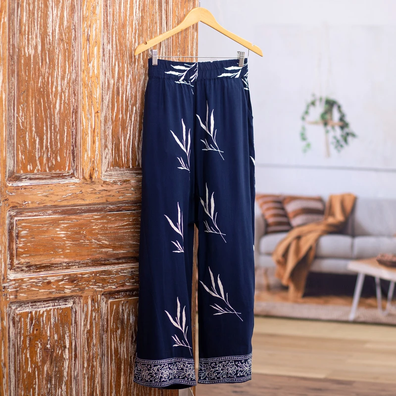 An elegant shade of midnight and white details enhance these graceful long pants designed by Indonesian artisan Endah. Using batik techniques, Endah hand-stamps floral and leaf motifs that embellish the entire design, making each garment unique and an elegant choice for summer soirees. These comfortable pants also feature an elastic waistband and two handy pockets on each side.