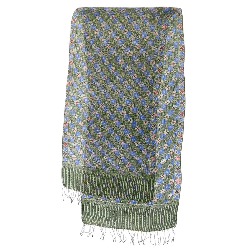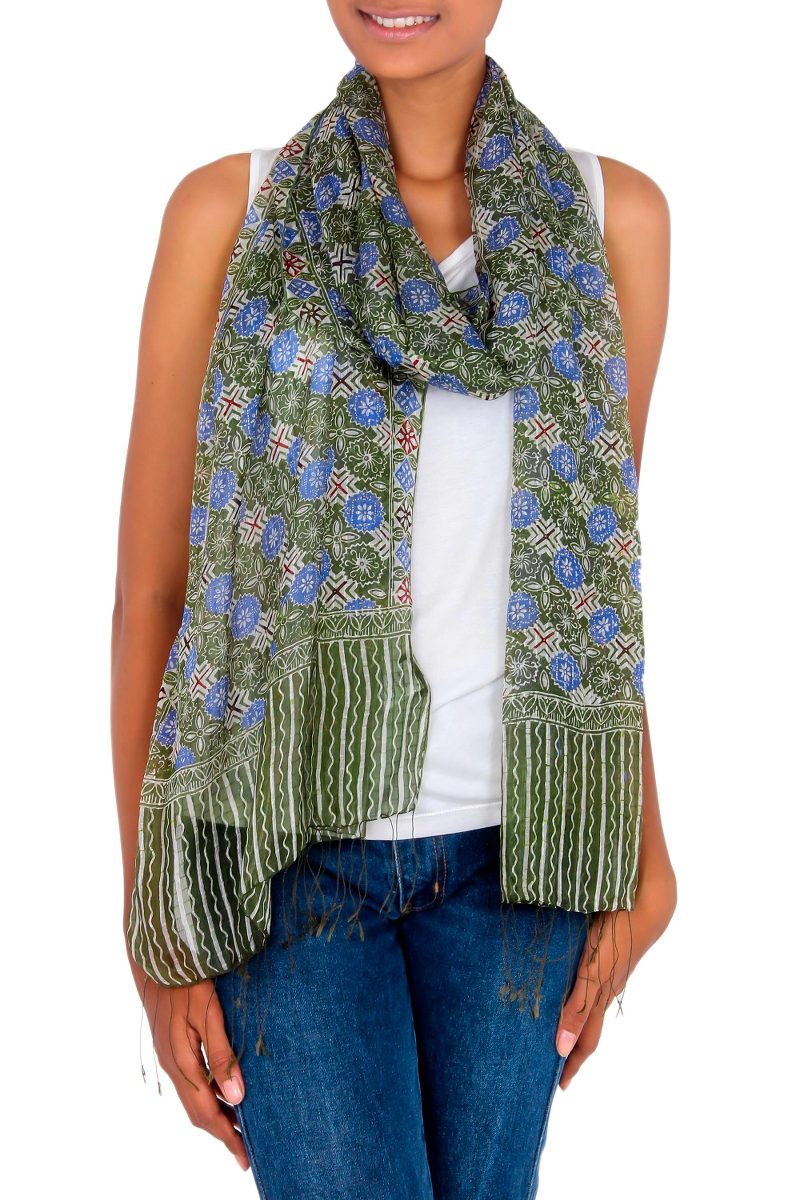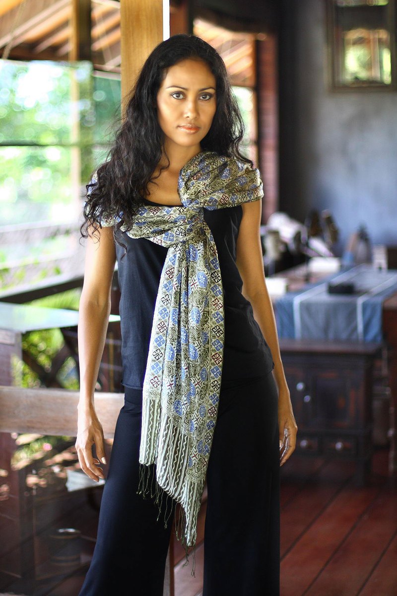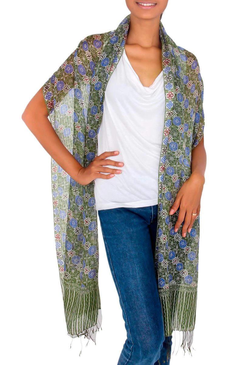 Backed by our 100% Happiness GuaranteeStars and flowers alternate in green and blue. Covering a silk shawl with beauty, the batik motifs are the creation of Yuni Kristina.