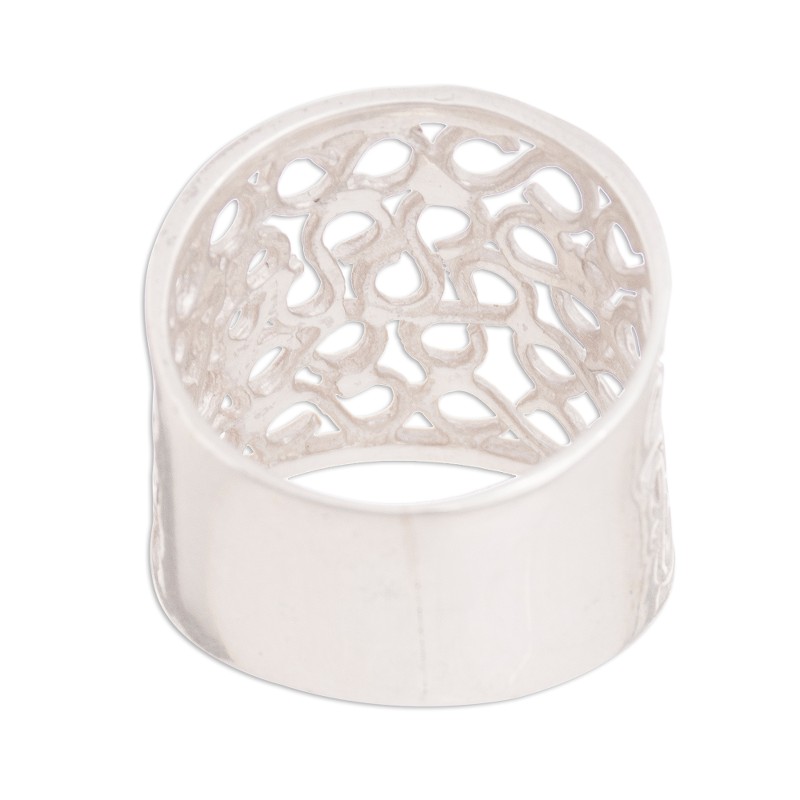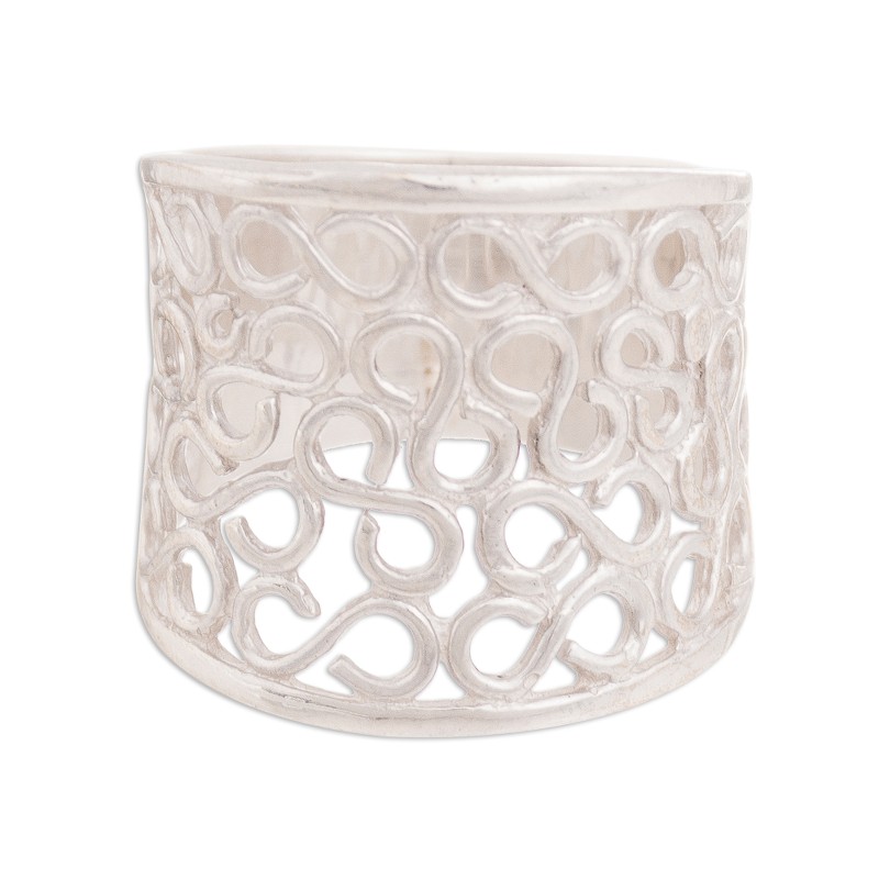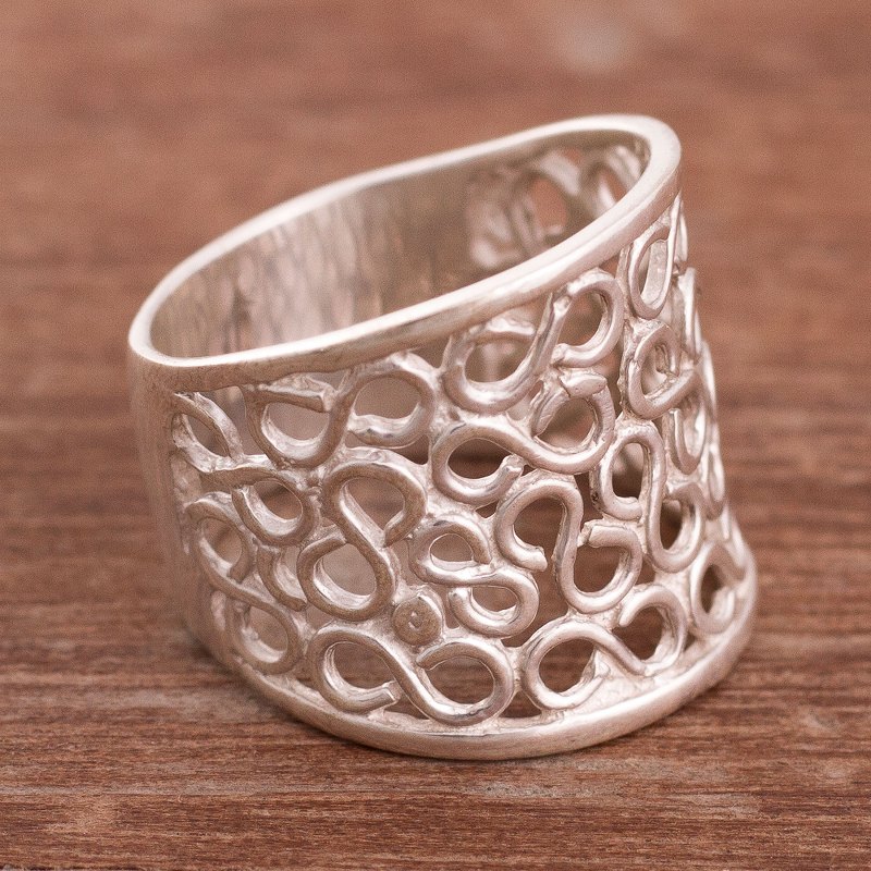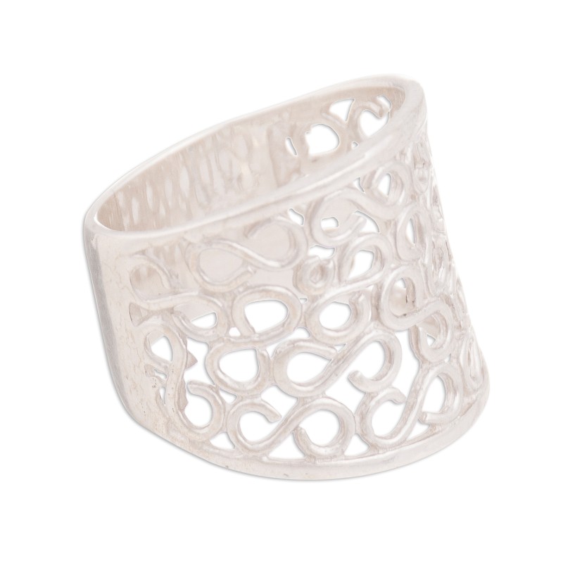 Crafted by hand from sterling silver, intricate infinity patterns in lovely openwork decorate the band of this ring from Peru. Marianela Vargas creates this ring, given a high-polish finish that gleams in the light.