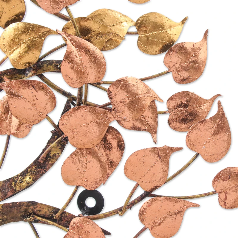 Backed by our 100% Happiness GuaranteeGolden and copper leaves welcome you to an enlightened forest where harmonious and wise souls give life to each living creature. Made to infuse your spaces with peaceful energies that invite you to meditation, Thai artisan Narakorn Wongnitkorn's newest steel wall art boasts accents of metallic foil to create a luminous illusion around a majestic tree.