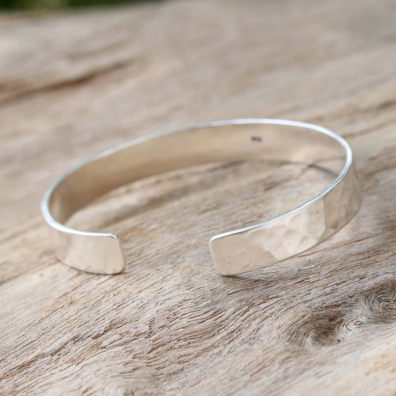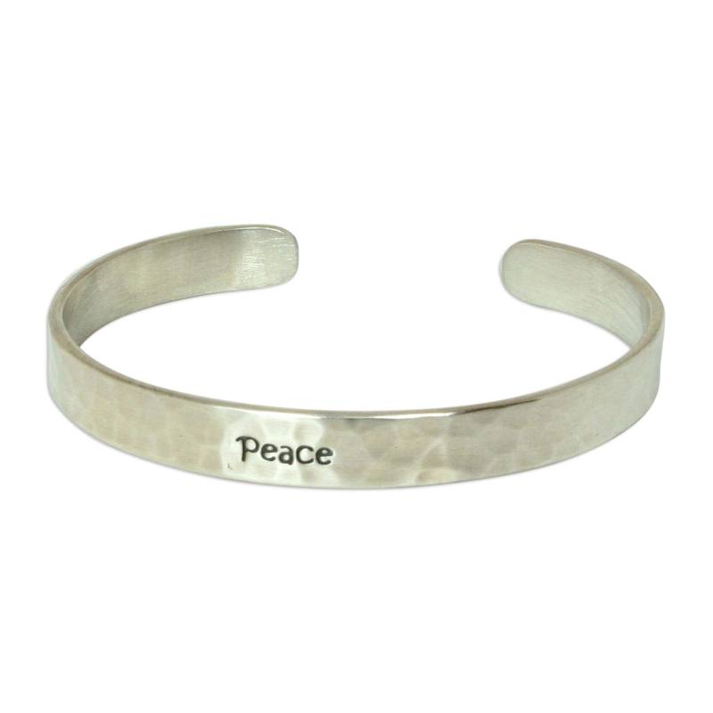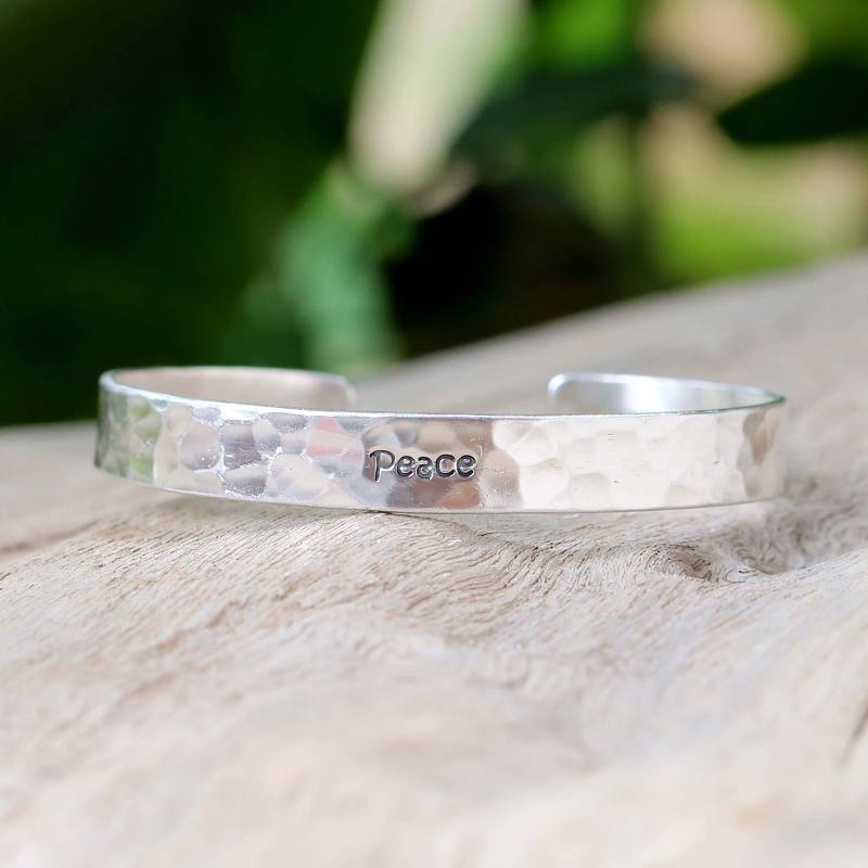 Backed by our 100% Happiness GuaranteeWithaya Cheunjit presents a design that showcases the beauty of handcrafted silver. Hammered textures envelop the wrist with a subtle radiance that carries a message. The cuff bracelet is engraved with the word "Peace."