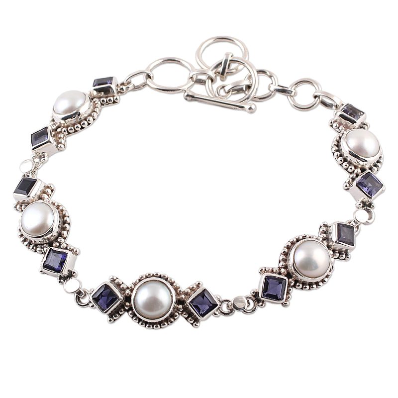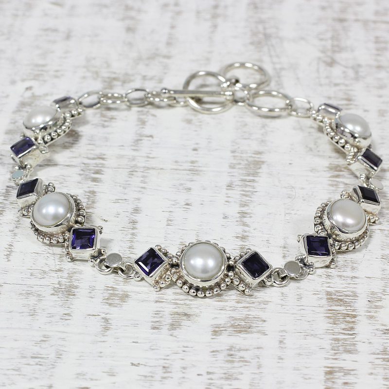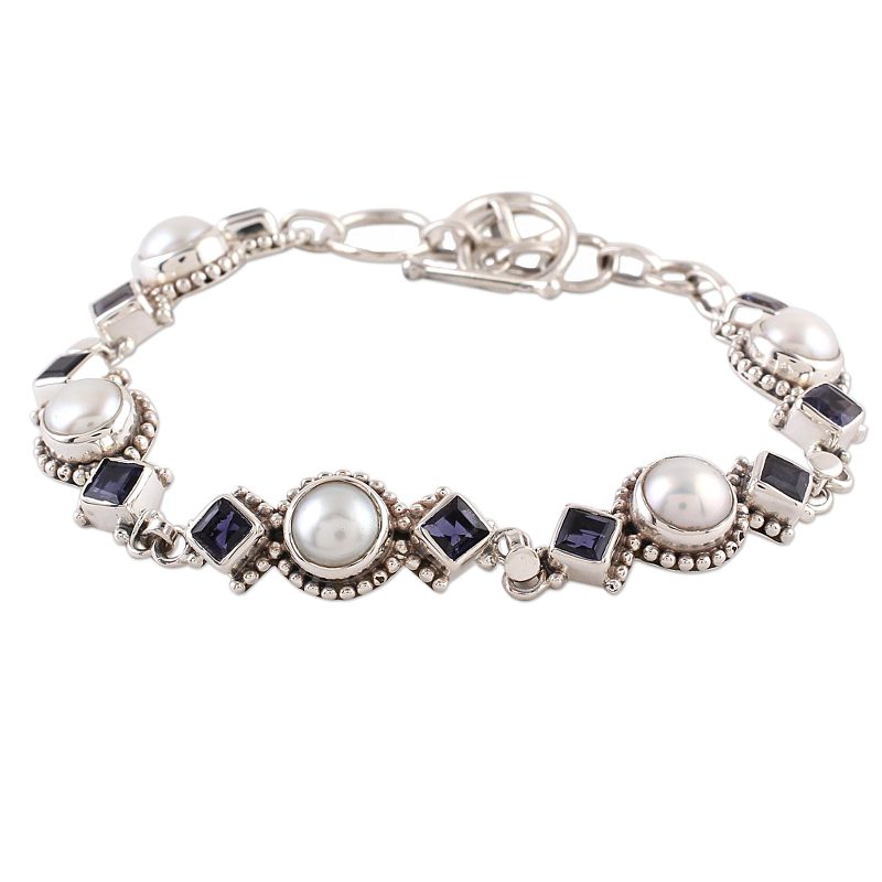 Glowing cultured pearls center each link in this bracelet, flanked by over two carats of blue iolite stones. Neeru Goel presents the link bracelet, crafted by Indian artisans of sterling silver with petite dot motifs.