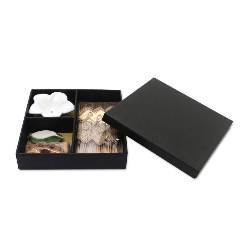 Backed by our 100% Happiness GuaranteeRelax and breathe in the rejuvenating scents in Balinese artisan Nyoman Suarmini incense set. The set is housed in a black cardboard box and includes two ceramic incense holders--one leaf and one flower--18 incense sticks in jasmine, ylang ylang, and sandalwood, and 10 incense cones in frangipani.