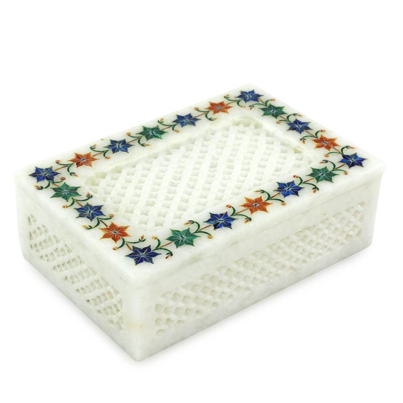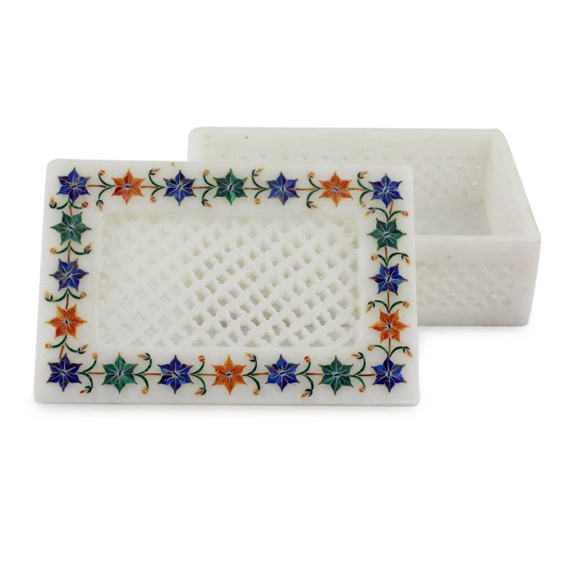 You can find our marble inlay jewelry box 'Jasmine Petals' by Raj Kumari and Raja Ram in jewelry boxes categories such as Floral Boxes, Jali Boxes, Marble Inlay Boxes and Marble Boxes. Enjoy exploring these sections for other Novica treasures.