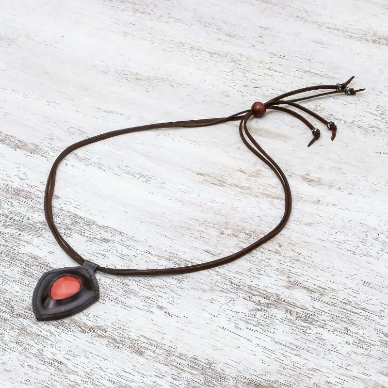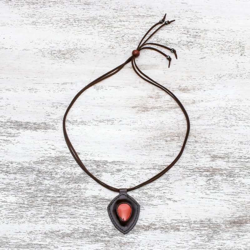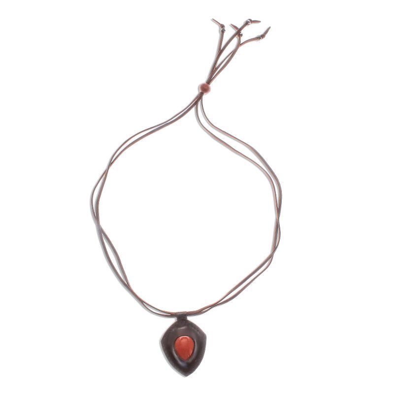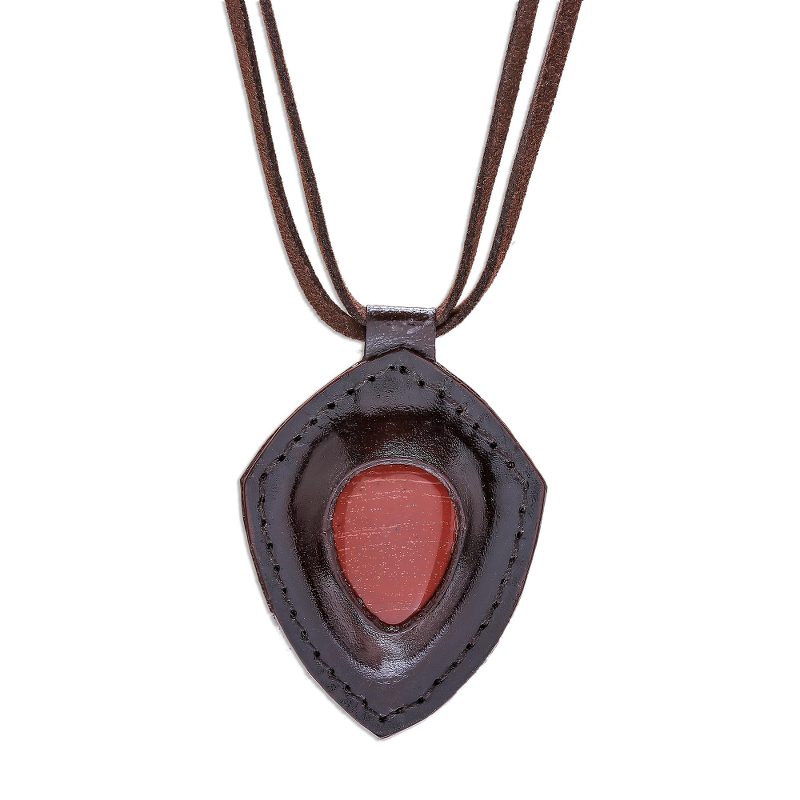 Resembling a bold shield, a jasper gemstone is displayed within a frame of dark brown leather. Chaloemphon presents this rustic Thai pendant necklace, circling the neck with a double strand of faux suede cord that adjusts with a sliding bead of raintree wood. Petite beads of black and white wood decorate the ends of each cord.