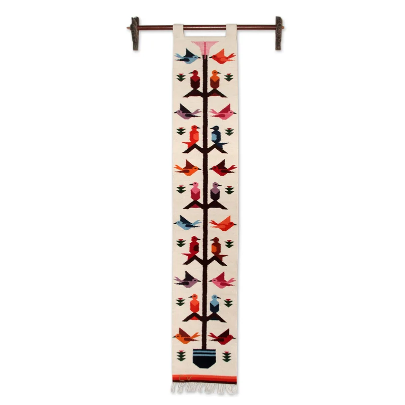 Perched on a slender trunk, migrating swallows return home for the summer. Cerapio Vallejo creates a beautiful image of Andean birds, detailing their brilliant plumage. Precisely woven on a traditional handloom, the wool tapestry is finished with fringe.