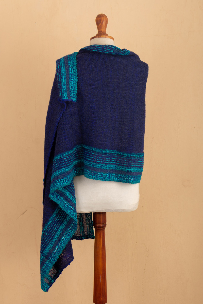 With its vibrant combination of midnight blue, cyan and sky blue hues, this remarkable shawl epitomizes elegance and allure. Meticulously knitted from a soft baby alpaca blend, this dreamy design by Peru's Raquel and Gregor is further accentuated by the delightful striped accents on the borders that will add a touch of sophistication to any ensemble. Prepare to captivate with your impeccable style every time you wear this shawl that is sure to turn heads.