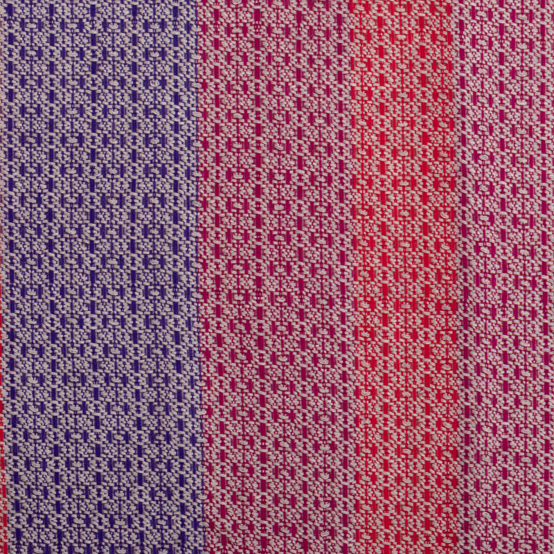 Lovely shades of ruby, wine and cobalt featuring intricate patterns harmoniously come together to form the elegant stripes that grace this vibrant shawl knitted from a soft baby alpaca blend in Peru. The versatile accessory designed by Raquel and Gregor is completed by delicate fringes on both ends that add an extra touch of glamor.