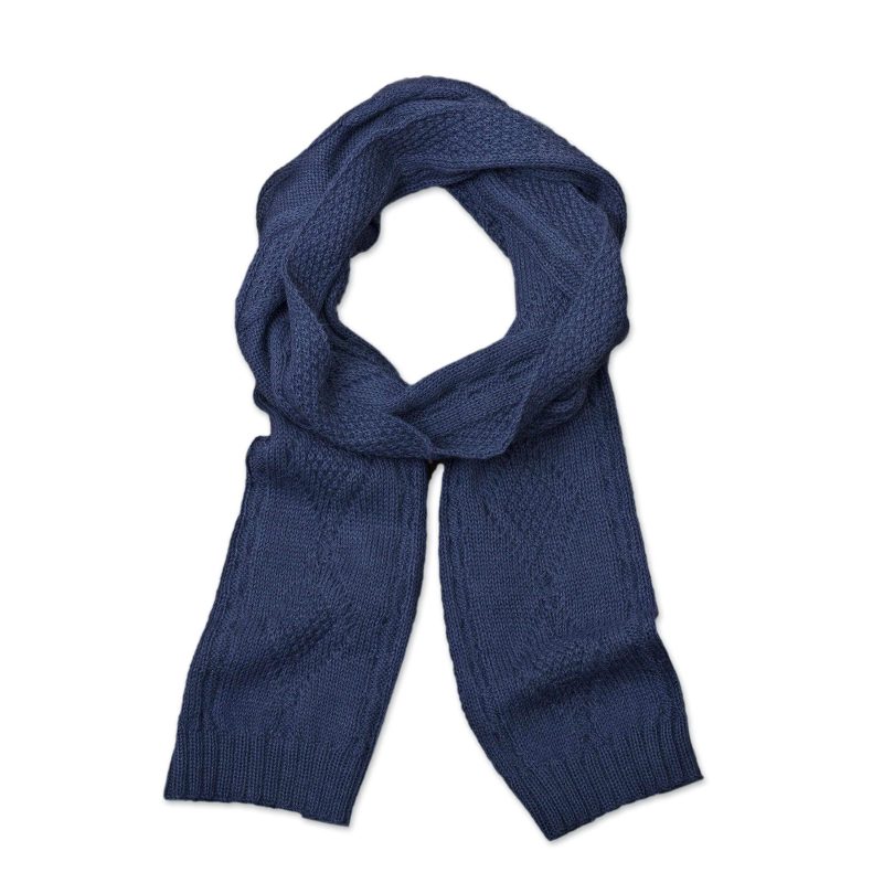 Working alongside his wife, Wilber Calapuja carries on the profession of his mother, crafting beautiful attire and accessories from Peru. He knits this unisex scarf from 100% alpaca wool that is soft and elegant. Created in azure blue, it features diamond and braid patterns knitted along its length.