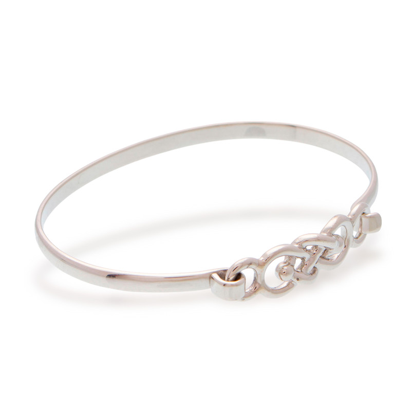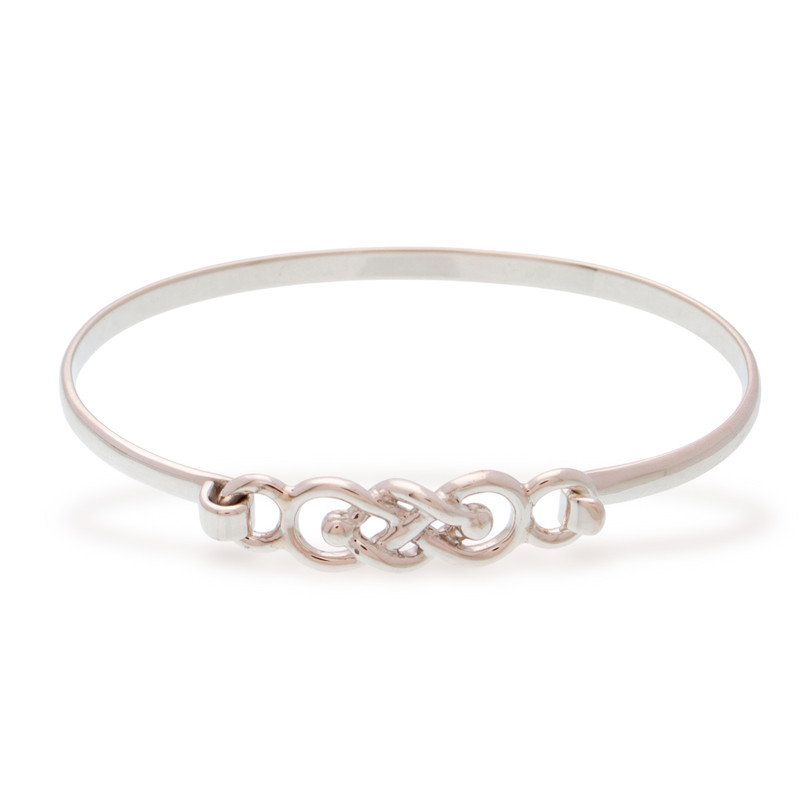 Inspired by Celtic motifs, intricate knot shapes are crafted from sterling silver to form the hook clasp of this bracelet. Mexican artisan duo Graeme and Philip Watson craft this bangle bracelet in the style of Taxco silversmithing.