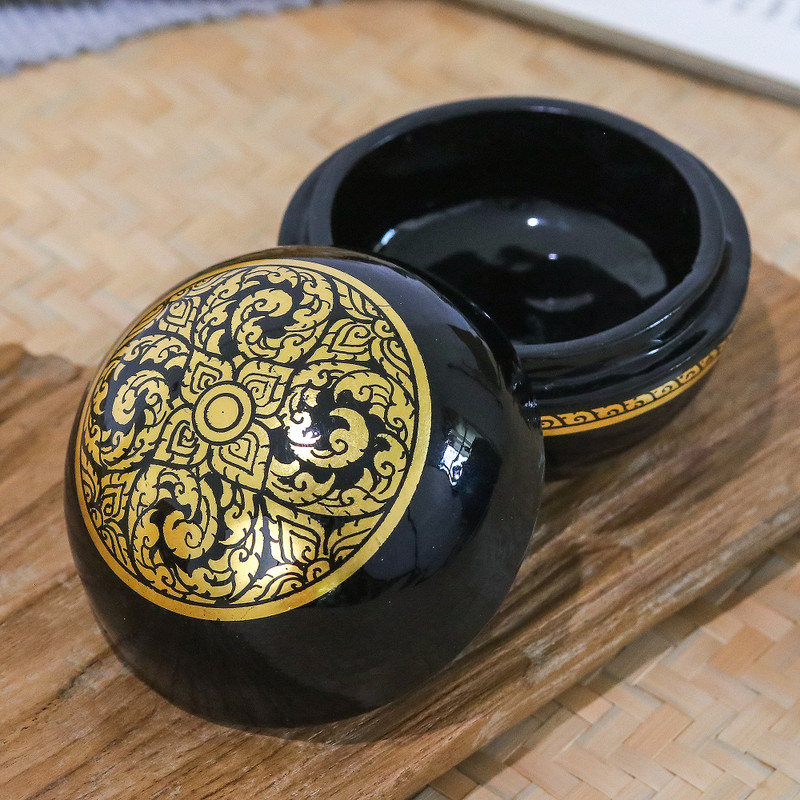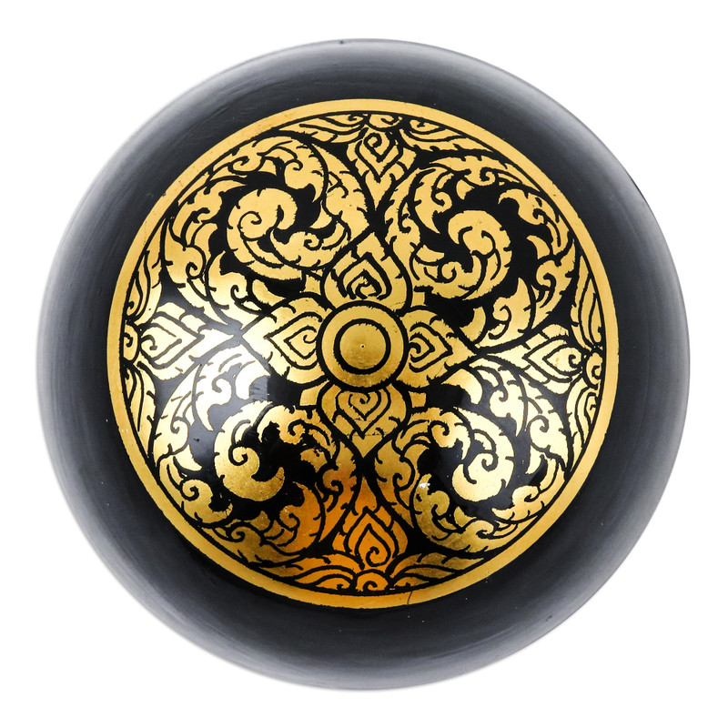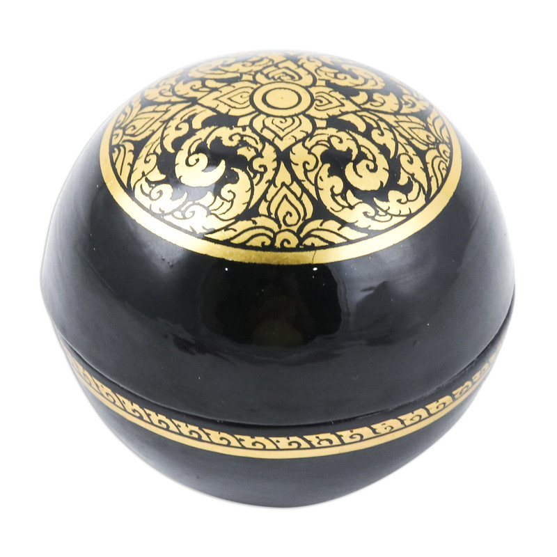 Exquisitely crafted from mango wood in the stunning Thailand, Prathin's newest creation arrives to embrace your beloved items with the region's elegance. The artisan works with delicate artistry on this round decorative box, whose palette of golden and black hues unites in a dapper floral pattern that illustrates the triumph of Thailand's arts over time. As a touch of sophistication, the piece has a lacquered finish.