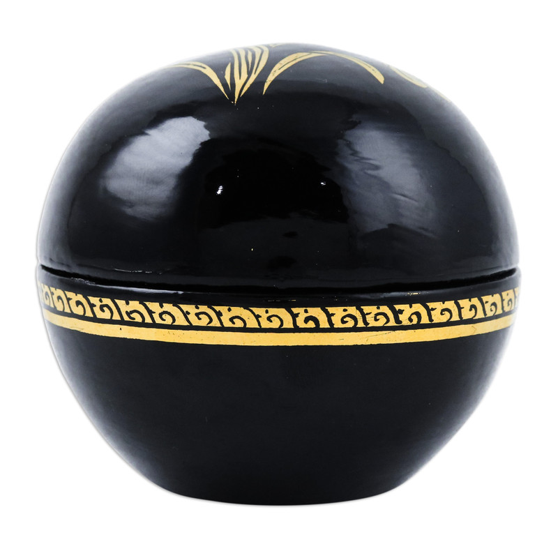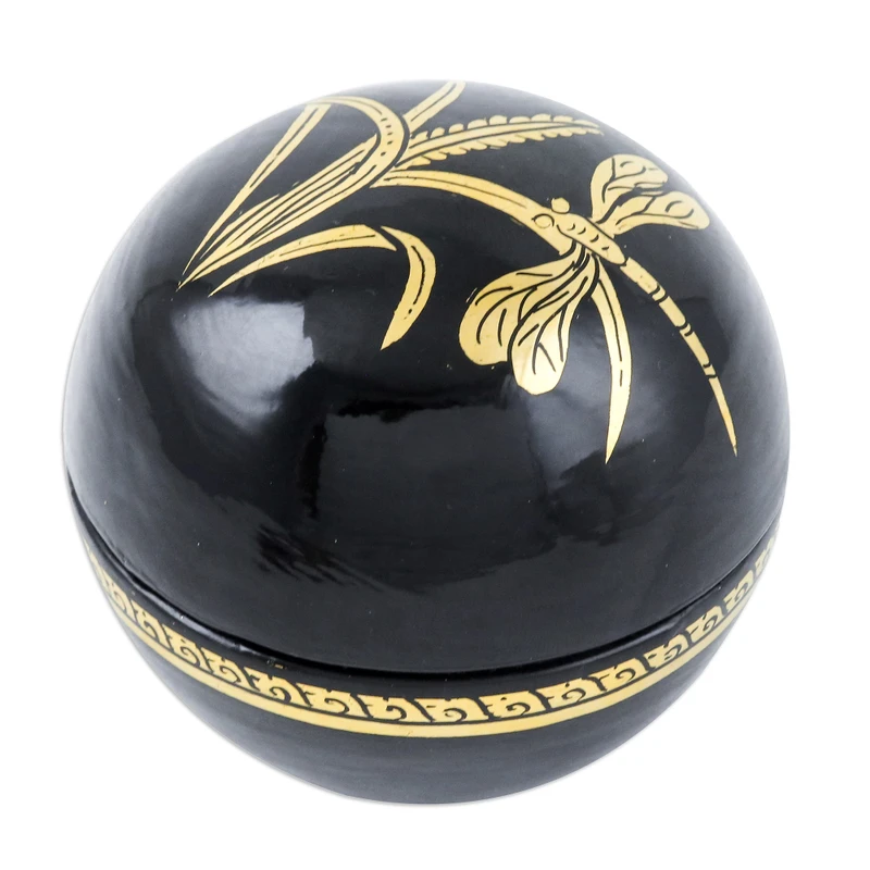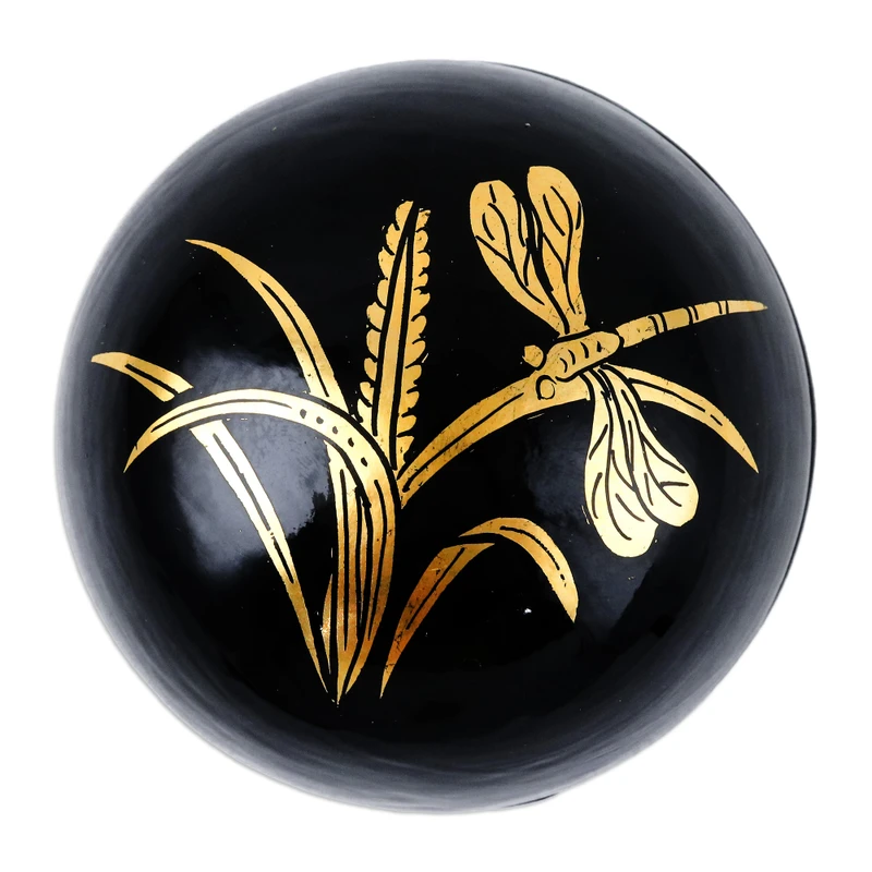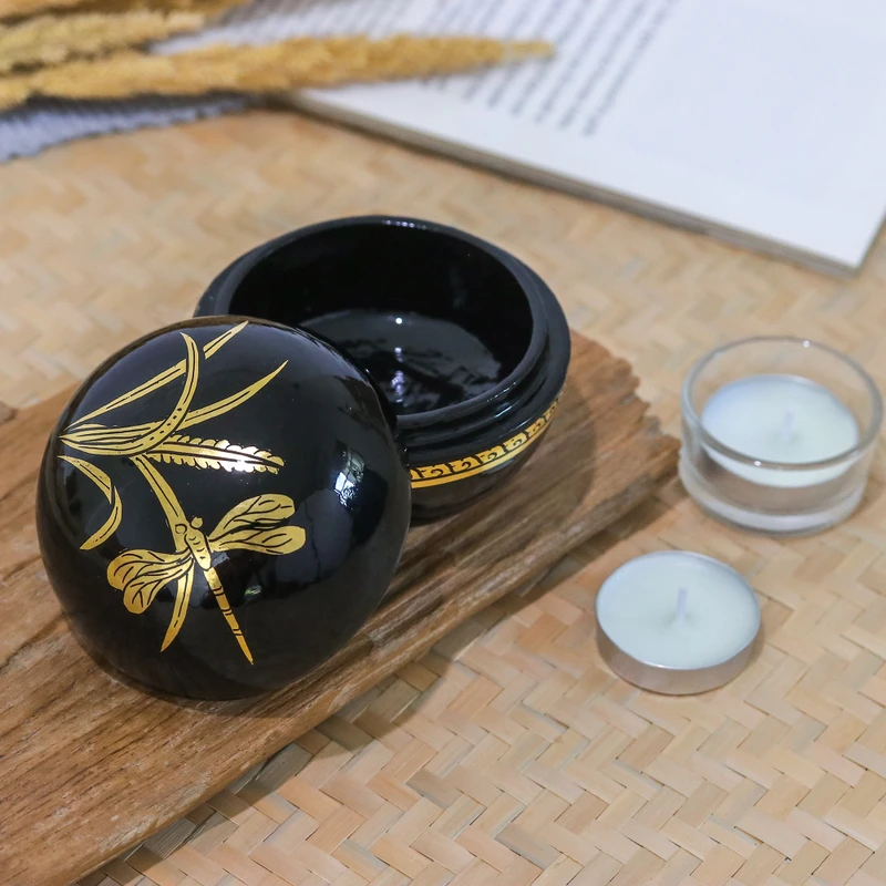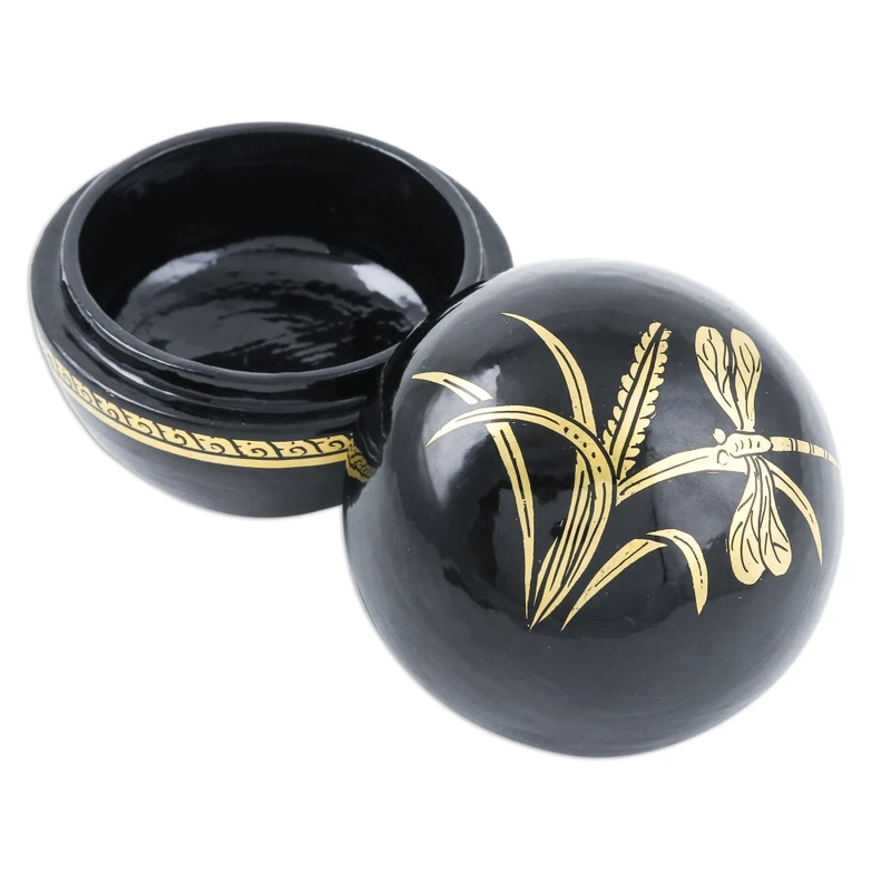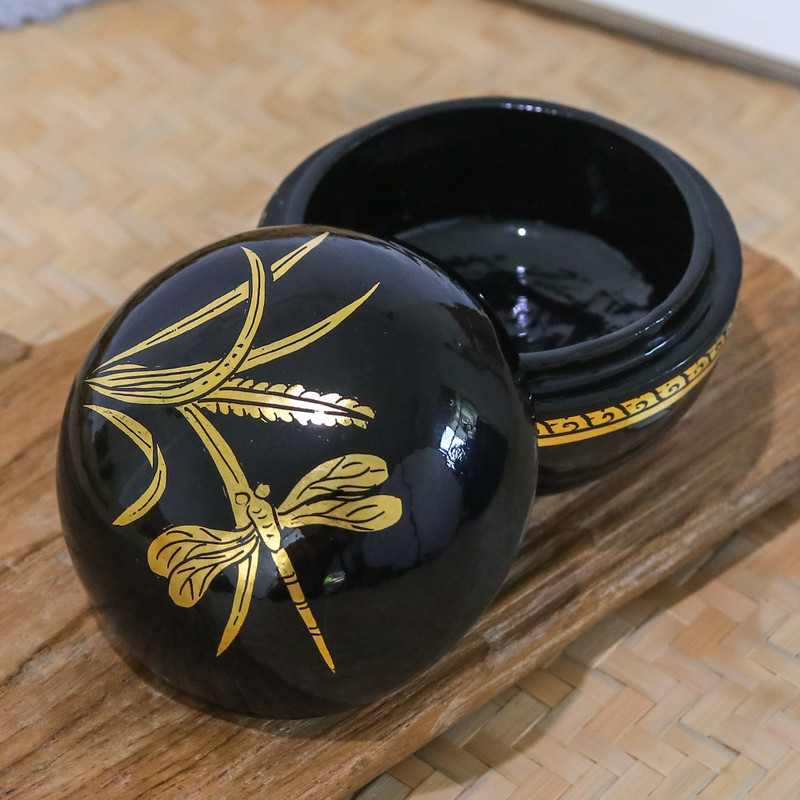 Gorgeously crafted from mango wood in the breathtaking Thailand, Prathin's newest creation arrives to embrace your beloved items with the region's essence. The artisan works with sublime artistry on this round decorative box, whose palette of golden and black hues unites the portrait of a dragonfly on a rice ear, representing Thailand's rich and tender nature. As a touch of fineness, the piece has a lacquered finish.