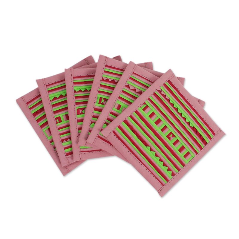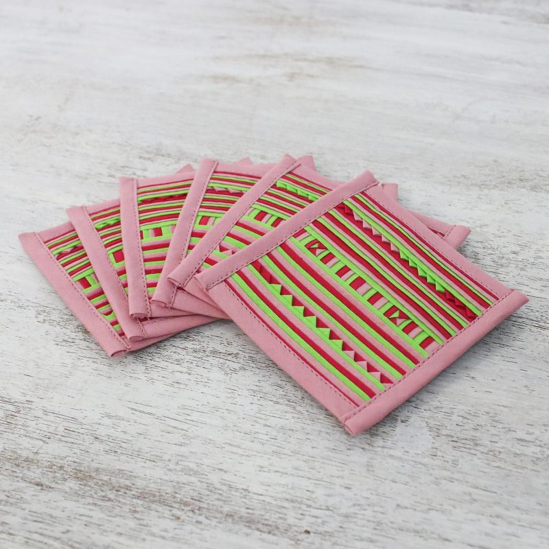 Backed by our 100% Happiness GuaranteeWoven by hand in the style of Thailand's Lahu people, geometric motifs appear in a colorful cotton blend. Artisans from Thai Tribal Crafts create this beautiful set of six coasters using shades of pink, cherry red and light green. Lahu women often augment their family's income with textile crafts, including this type of patchwork appliqué.