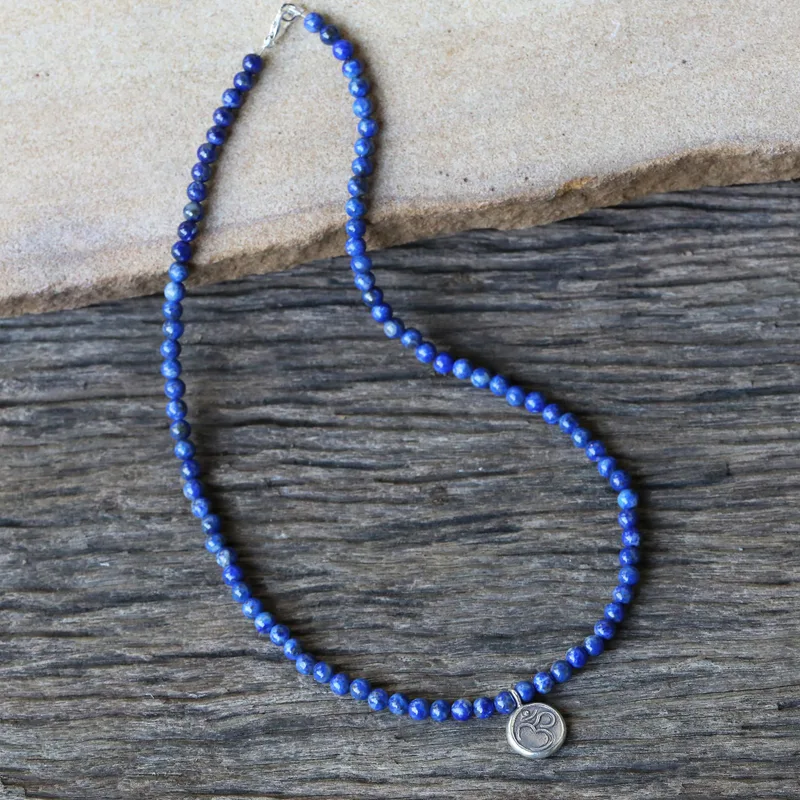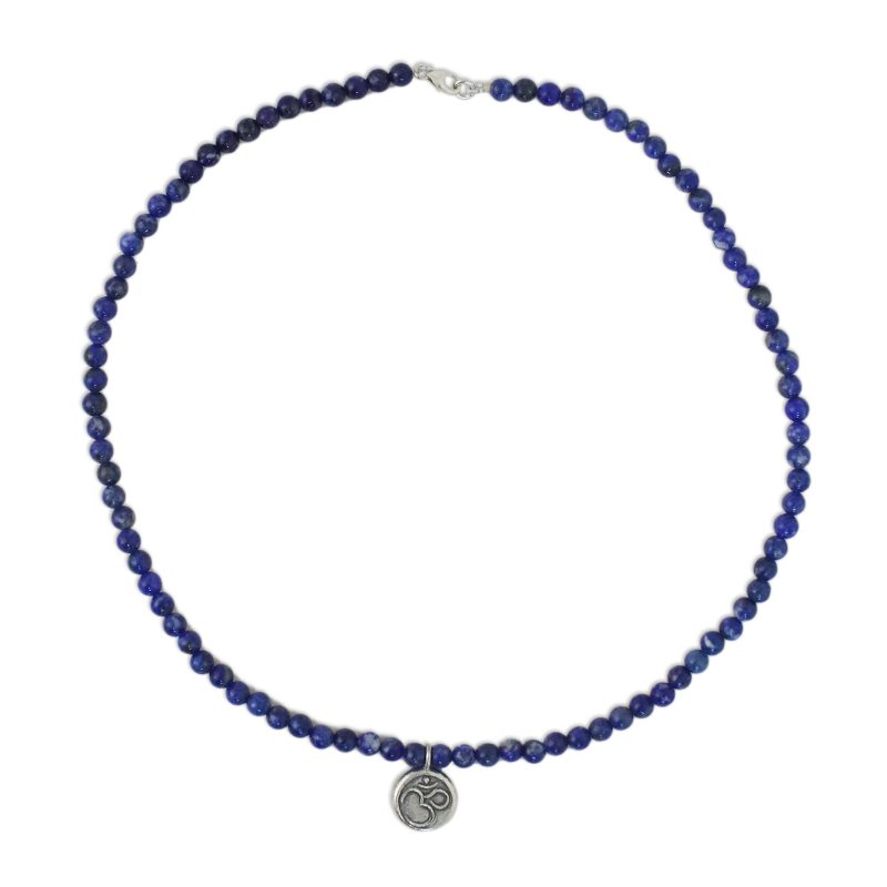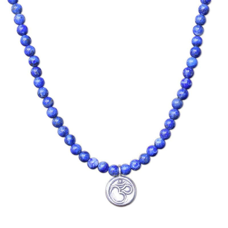 The blue lapis Om necklace is beautifully detailed . The lapis is a derp blue and the silver Om is finely detailed and shaded . It is lovely and it also makes me feel that way while wearing it too