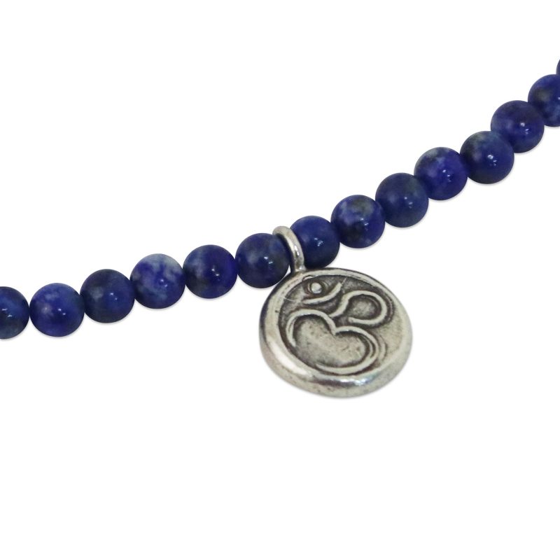 A beaded strand of dyed blue lapis lazuli stones hosts a circular pendant of silver handcrafted by Karen hill tribe silversmiths, depicting the meditative omkara symbol for om. Thailand's Srimuang designs and crafts this fantastic necklace.