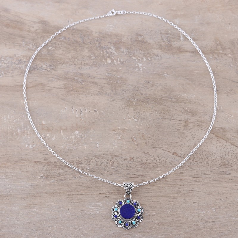 A radiant lapis lazuli gemstone is both beautiful and inviting in this stunning pendant necklace from India's Alok Jain. Encircling the gorgeous stone is a series of alternating cabochons of beautiful lapis lazuli and vibrant composite turquoise. A sterling silver roping design and dot motifs bring further dimension and style to the pendant, which hangs charmingly from a sterling silver chain.
