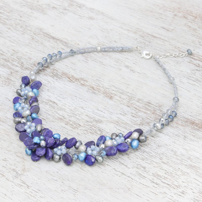 Featuring an impressive array of lapis lazuli, cultured pearl, and petite glass beads, this pretty beaded necklace circles the neck with a fascinating cluster of color. Thai artisan Nareerat designs the necklace, working with local artisans to diligently apply each bead by hand. The necklace is completed with a sterling silver plated brass clasp and extender chain.