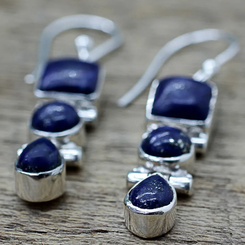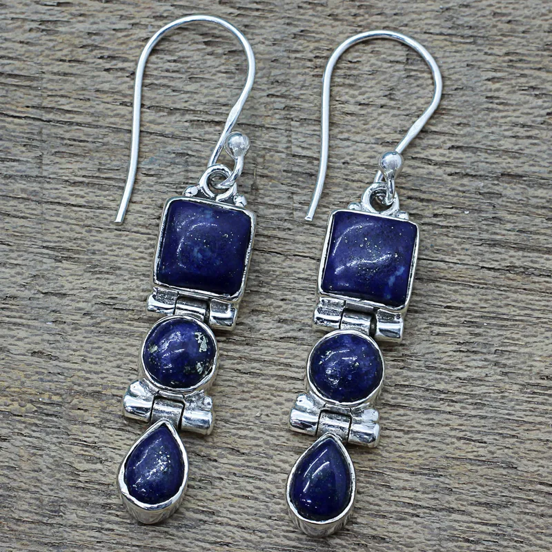 Backed by our 100% Happiness GuaranteeDesigned by Indian artisan Neeru Goel, these stunning dangle earrings feature faceted square, round, and pear shaped lapis lazuli stones in sterling silver bezel settings. Lapis lazuli is traditionally thought to relieve anger and dispel negative thoughts from its wearer.