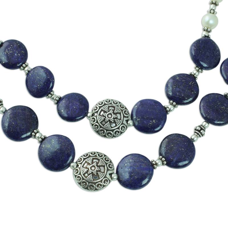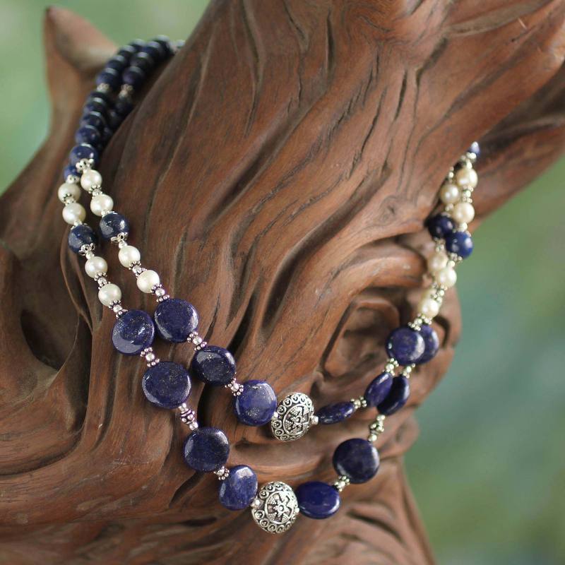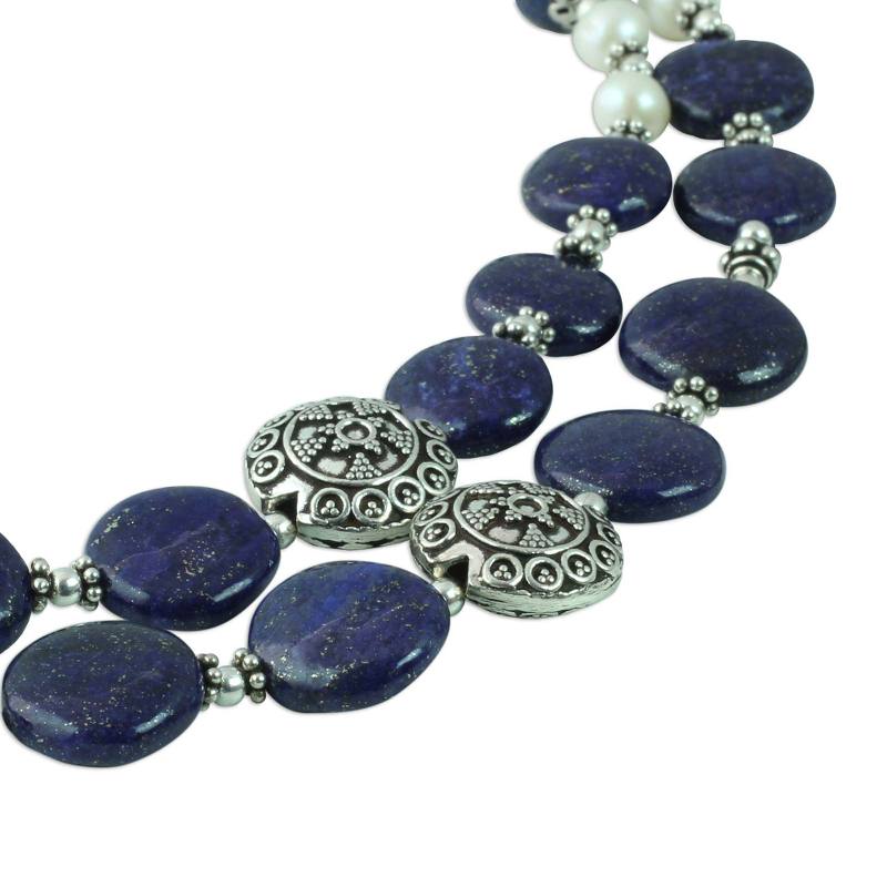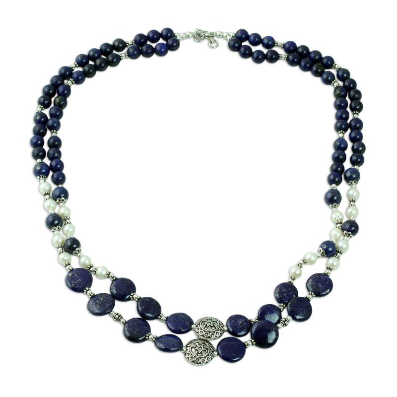 Featuring cultured freshwater pearl in natural cream tones and lapis lazuli stones, this long beaded necklace encircles the neck with two gemstone strands. Indian artisan Narayannii presents her handcrafted design with sterling silver beaded accents.