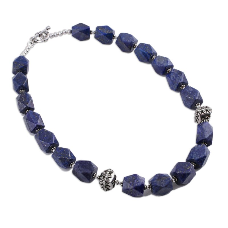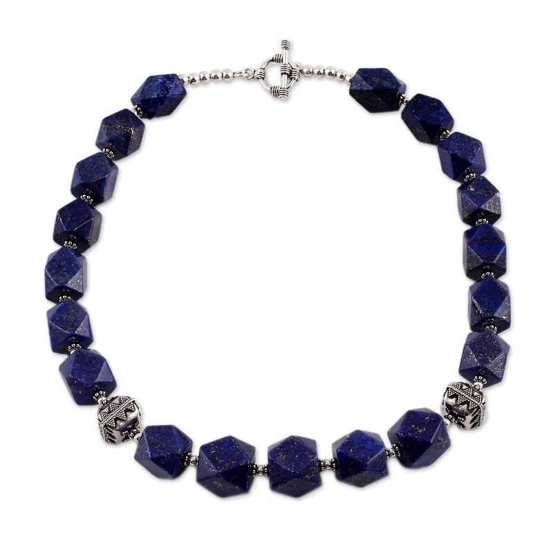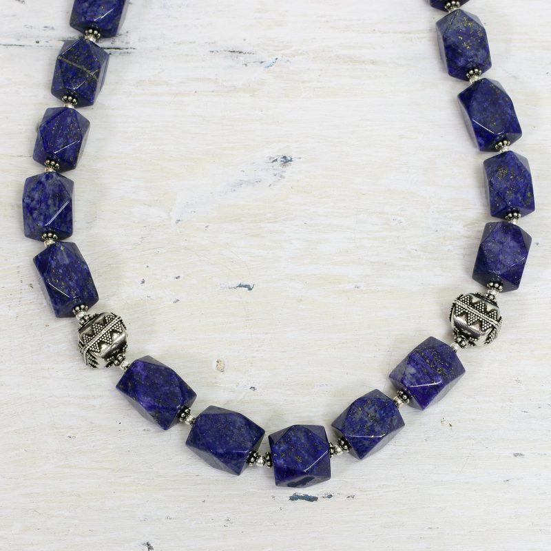 Backed by our 100% Happiness GuaranteeMysterious and beautiful, lapis lazuli encloses shining flecks of color. Narayannii showcases the deep blue stone in a bold strand necklace. Ornate silver beads whisper stories of ancient empires.