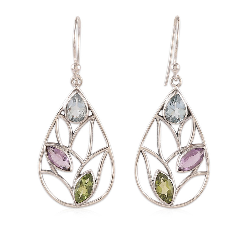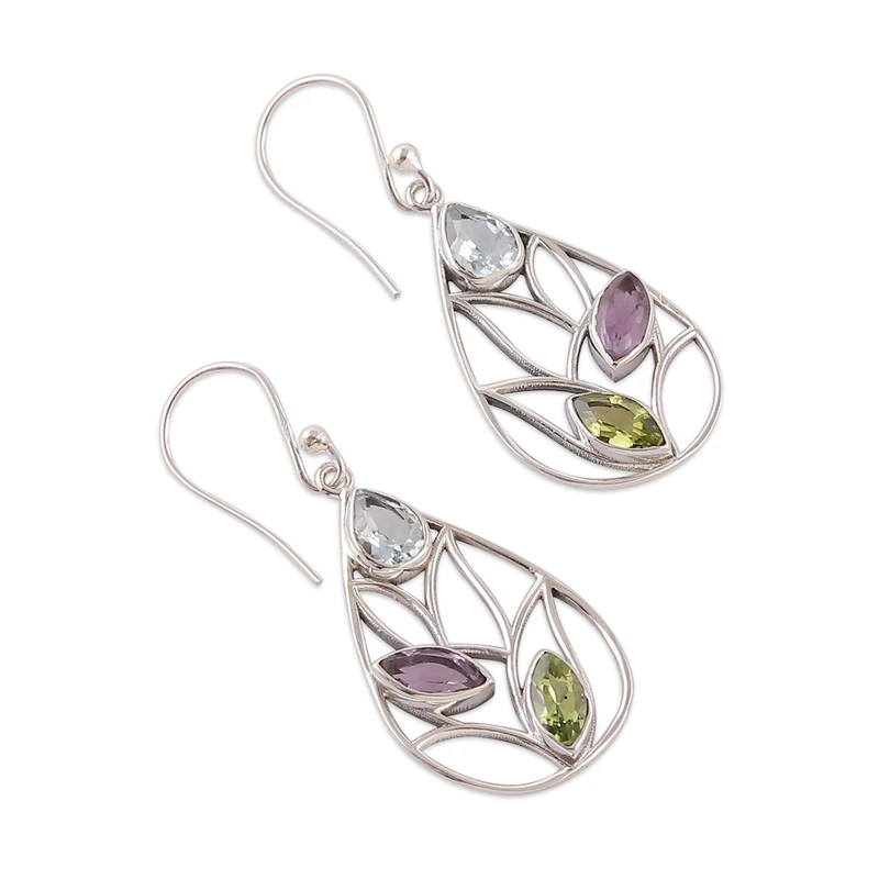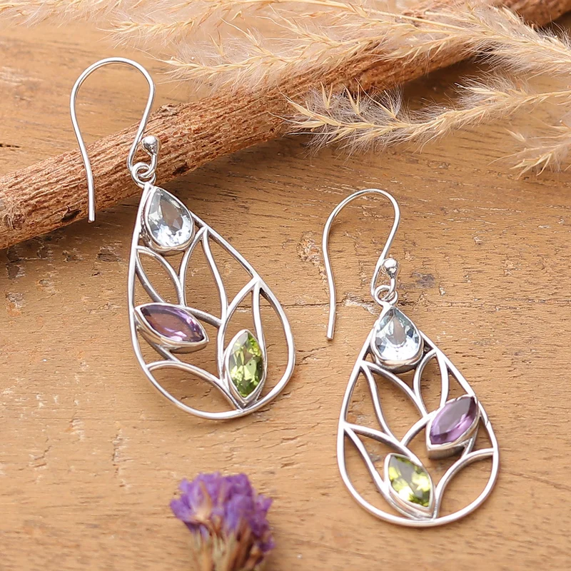 Boasting lovely openwork details and delightful leaf motifs, these sterling silver dangle earrings feature a dazzling array of gemstones that brings a splash of color to any outfit. The mirror-like polished finish of the silver setting amplifies the natural brilliance of the blue topaz, peridot and amethyst stones, creating a perfect balance of vibrant energy and sophisticated style in a unique design presented by India's Neeru Goel.