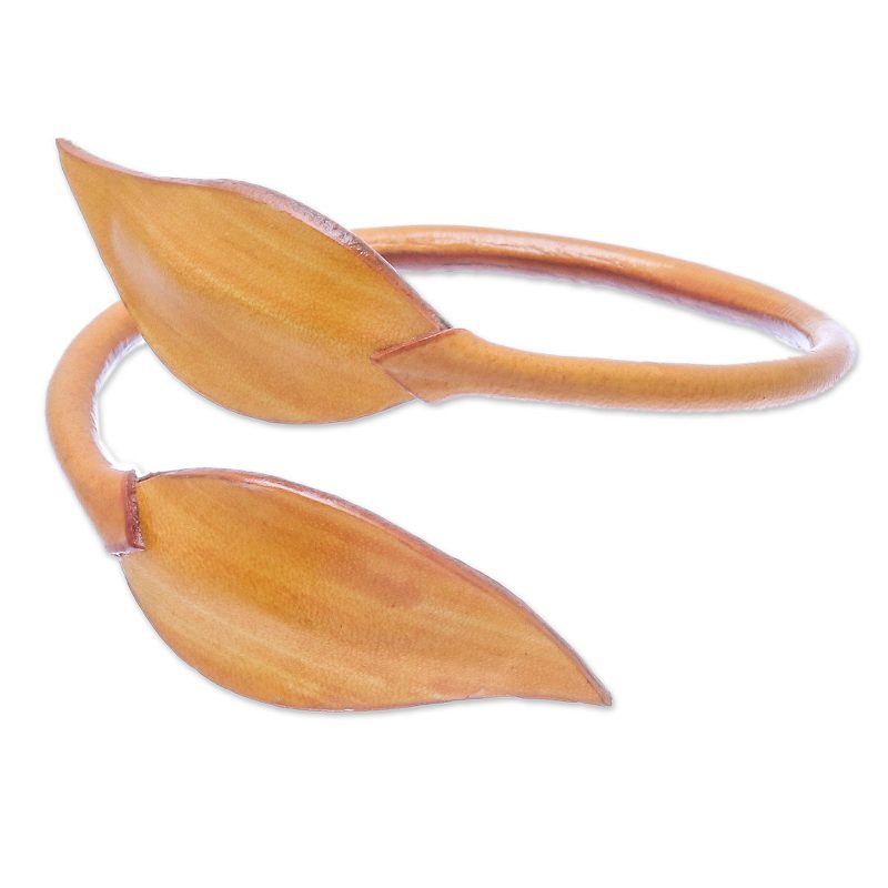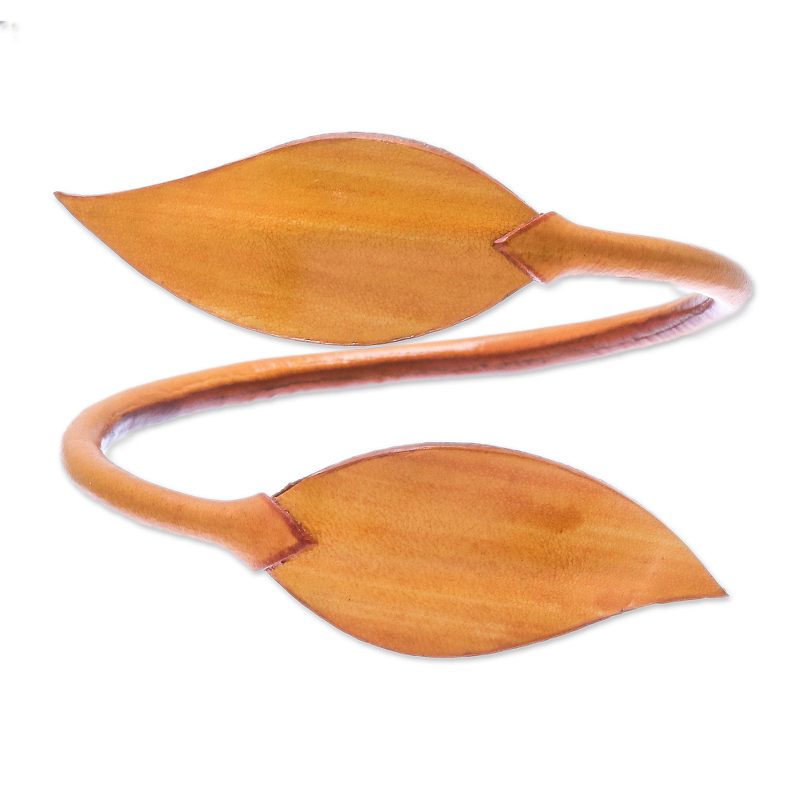 Embracing the wrist with saffron-colored leather, this wrap bracelet is created by Chang in Thailand. Handcrafted leafy pendants are displayed side-by-side at the front of this lovely bracelet. Pliable wire within the cuff lets you gently shape it for a custom fit.
