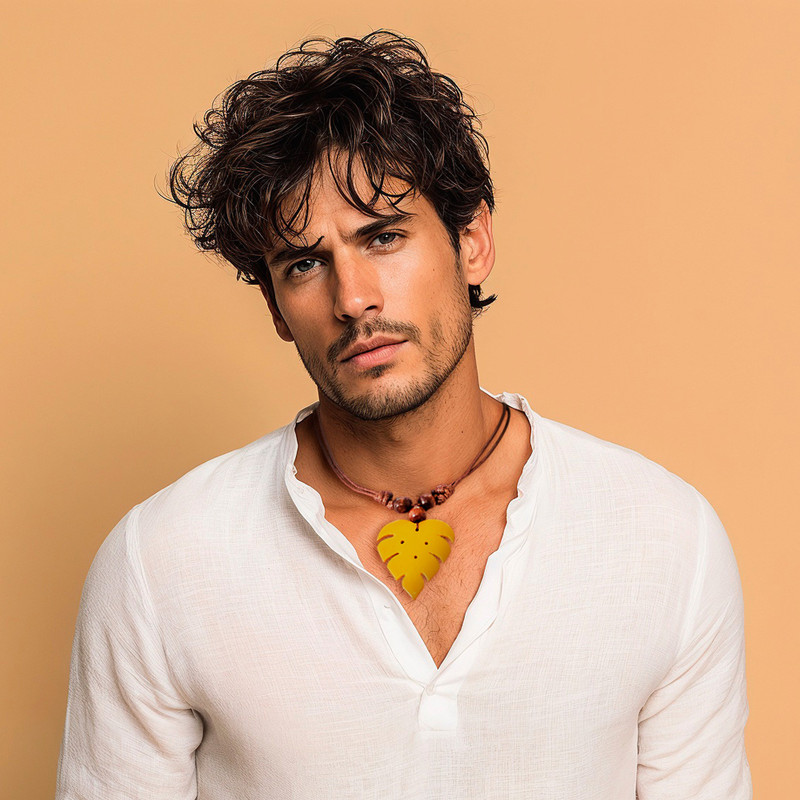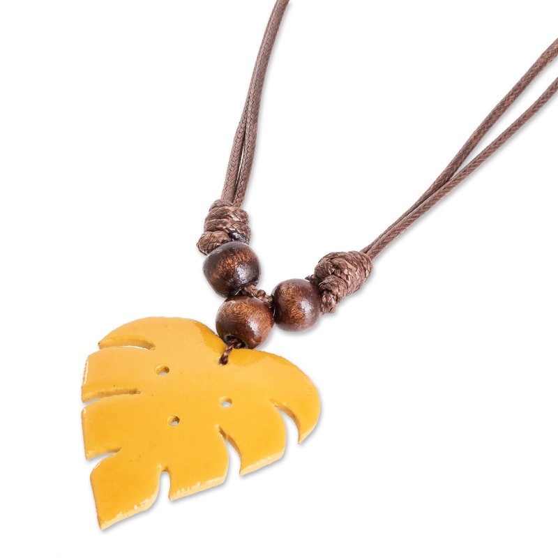 Backed by our 100% Happiness GuaranteeThe vitality and festive energy of the Costa Rican forests inspire a stunning design that captures the essence of the tropical jungle. Artisan Kattia López uses a calabash gourd to create the leaf pendant that embellishes this unique necklace, painting it in a sweet yellow hue that symbolizes happiness. As a way to enrich the design's natural aura, Kattia adds pinewood beads to the brown cord and finishes the accessory with a convenient sliding knot that can be adjusted to your liking.