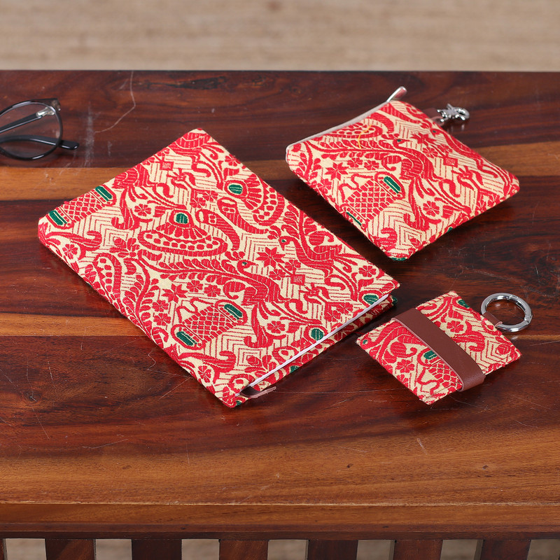 An exquisite three-piece set consisting of a journal, a pouch and a keychain pays homage to the rich heritage of the region of Assam in India. Designed by Manjuri Hazarika, these accessories are handcrafted from cotton using the traditional jacquard weaving technique, boasting intricate Assamese patterns that reflect the artistic traditions of the region. These accessories are further enhanced with leather accents as well as stainless steel and nickel-plated metallic fixtures. The journal's 100 unlined pages are made from recycled paper, providing a versatile space for writing, sketching and more. The zippered, lined pouch keeps small essentials organized and secure. And the keychain safely stashes earphones for on-the-go listening thanks to its leather strap with a snap closure.