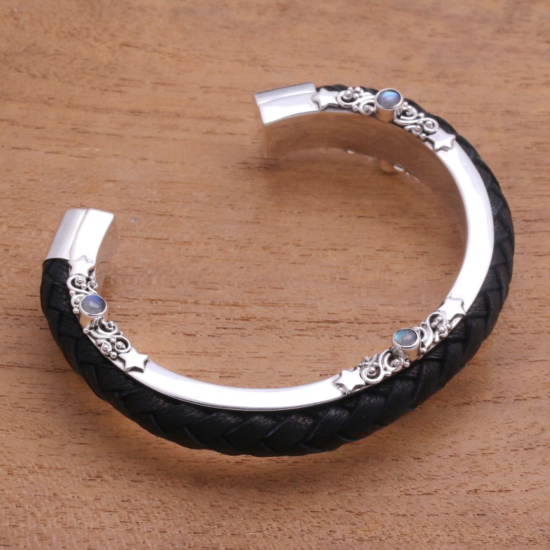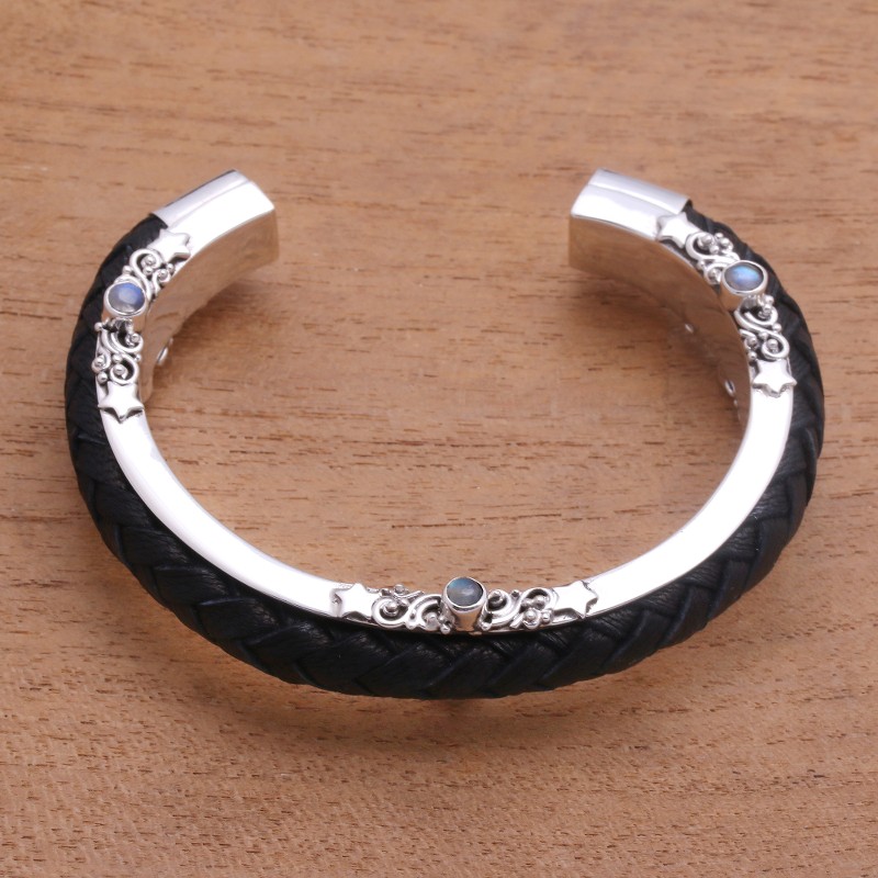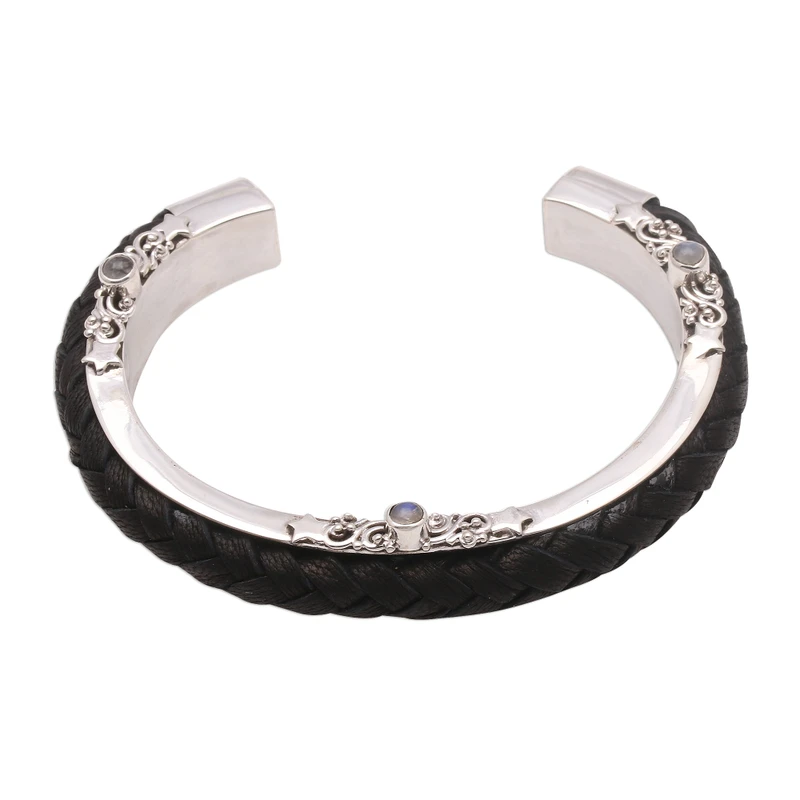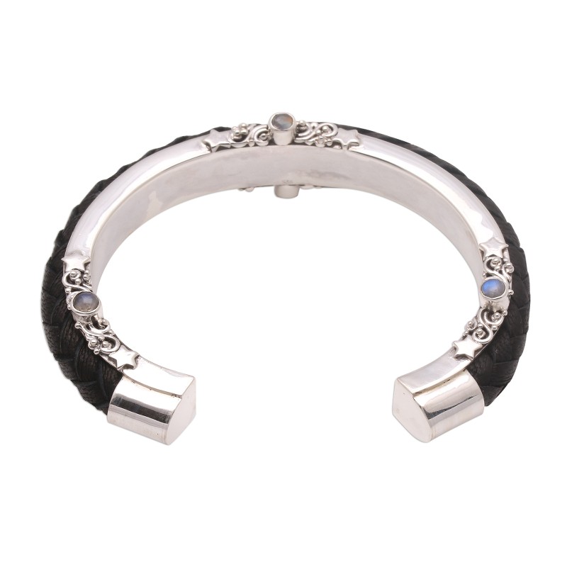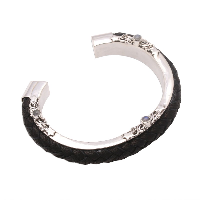 Created by Balinese artisan Buana, this cuff bracelet combines the gleaming beauty of sterling silver with hand-braided leather. Petite rainbow moonstone gems accentuate both sides of the cuff.