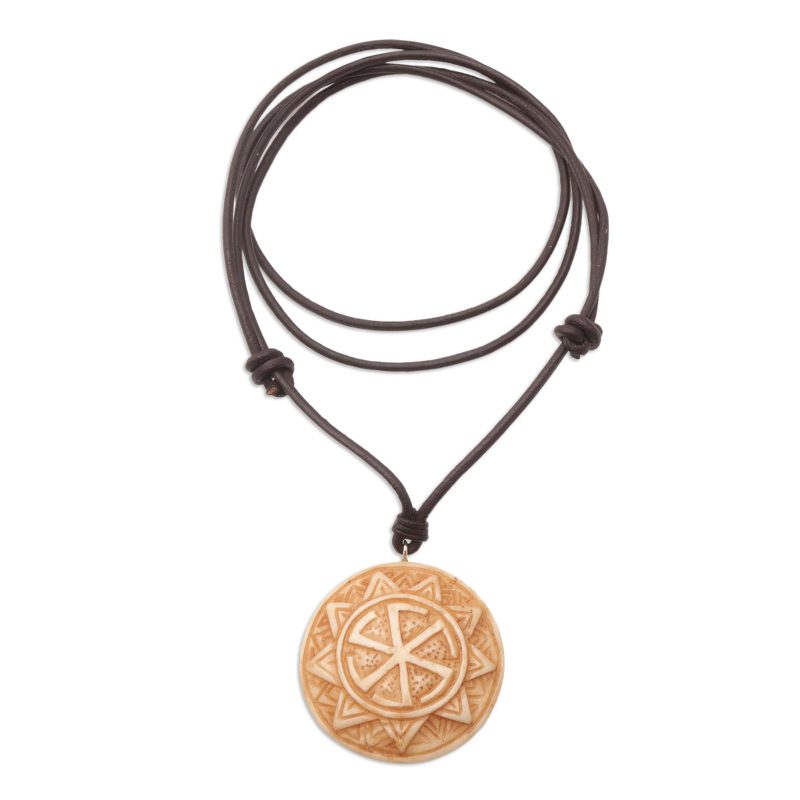 Backed by our Happiness GuaranteeThe Kolovrat wheel is an ancient Slavic sign intended to honor the sun and fire. Used as a divine symbol, it is now part of a bewitching necklace handcrafted by Balinese artisan Made Wardika. After carving the magical image on cow bone, the artisan adds a sterling silver hoop that joins the piece to a leather cord with an adjustable length.