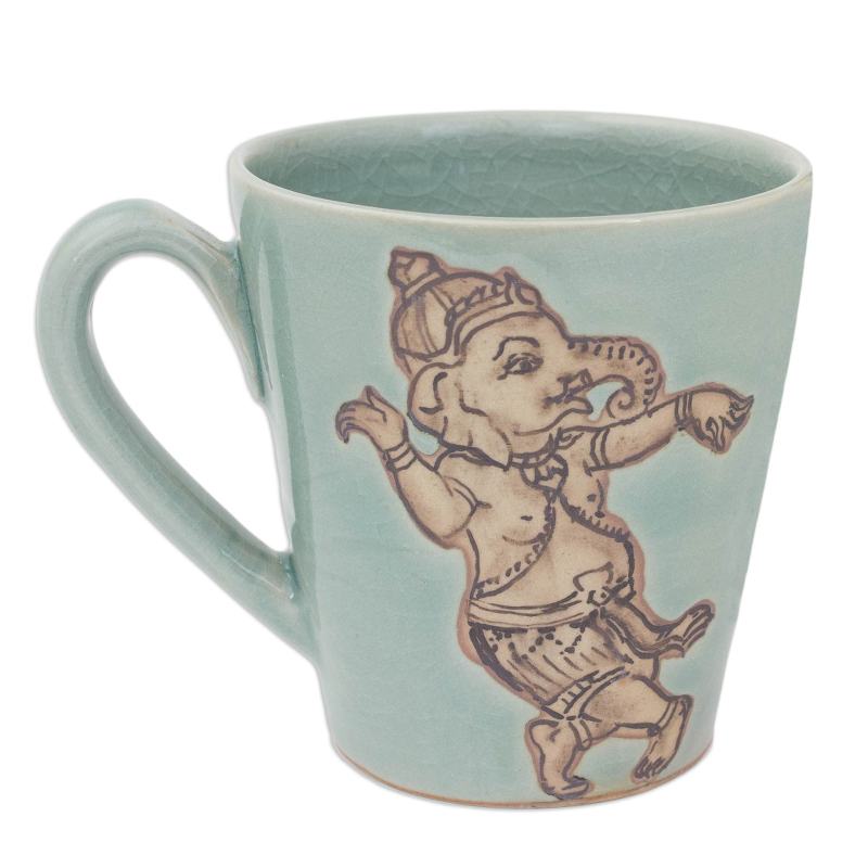 The Hindu god of auspiciousness, or success, Lord Ganesha is greatly revered in Thailand and is portrayed here with the head of an elephant, one tusk, two of his four hands, and his belt swaying as he dances. Duangkamol hand-paints his whimsical image in brown on this light blue mug, which she renders of Celadon ceramic. Ganesha's image is unglazed, while the rest of the mug features a crackle finish.