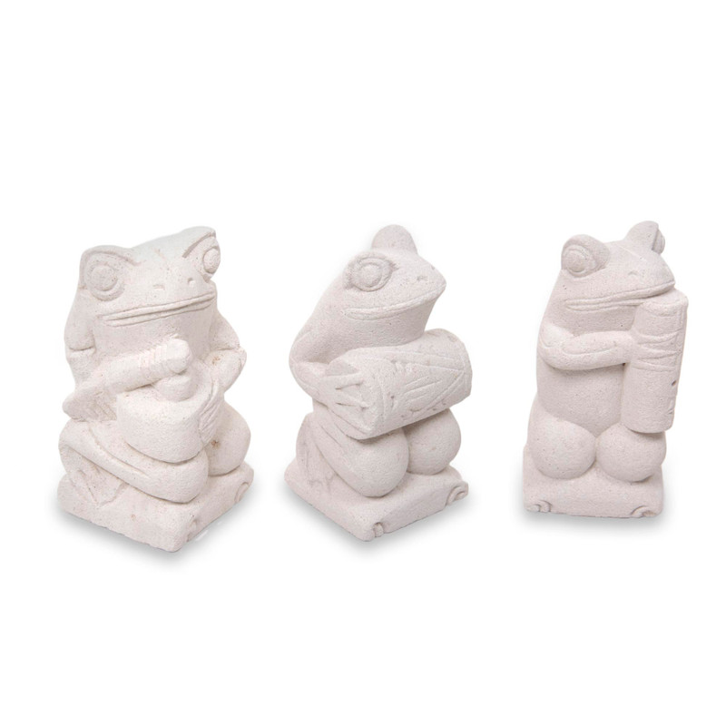 Sweet and talented, musical frogs play traditional Balinese musical instruments including the kelinang, the kenang and the suling. Nyoman Rely carves the expressive statuettes by hand from limestone, its natural hue accentuating every vivid detail.