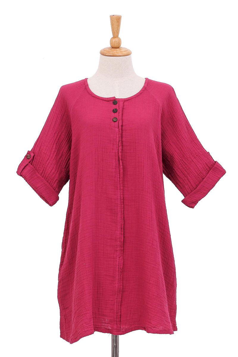 This swingy long tunic is from Ying and Joy in Thailand, who craft it from double cotton gauze in a delicious shade of raspberry. The top features three-quarter length roll-tab sleeves and a Henley-style button placket with coconut shell buttons.