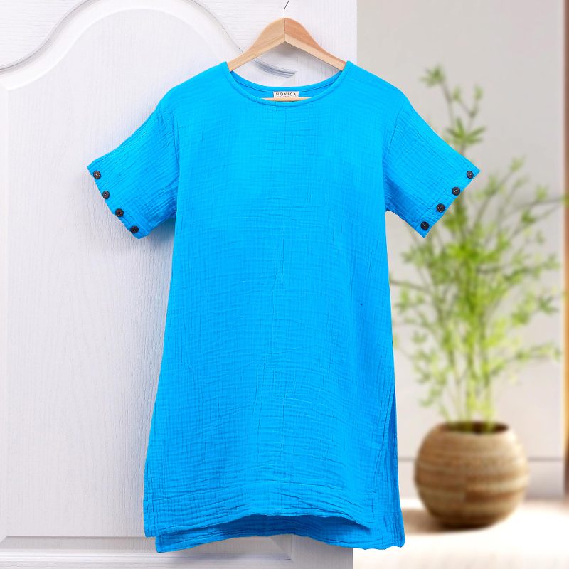 Easygoing and comfortable, this long tunic from Ying and Joy in Thailand will quickly become a favorite. The tee-style tunic is crafted from double cotton gauze and features deep slits on both sides and coconut shell button accents on the sleeves. Pair it with jeans or leggings, or use it as a cover-up at the pool or beach.