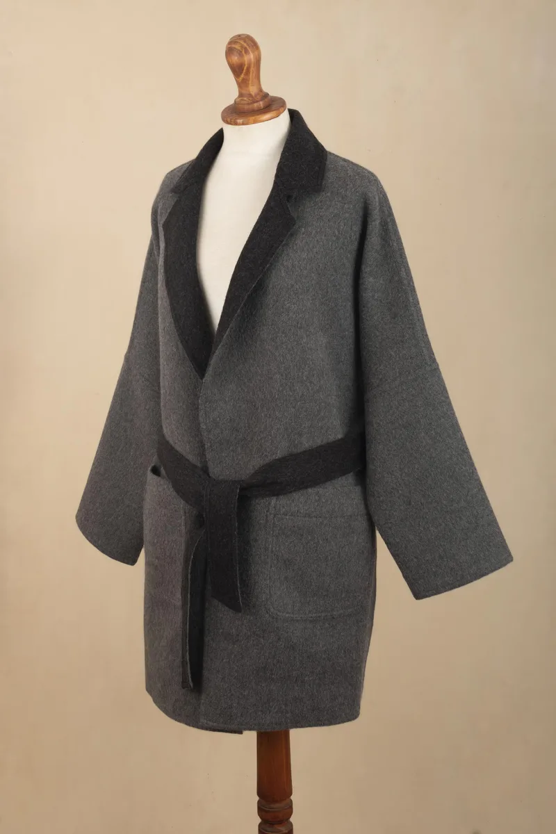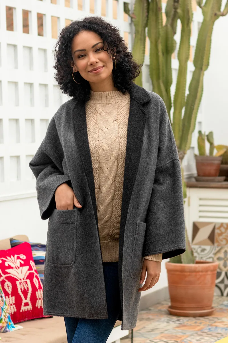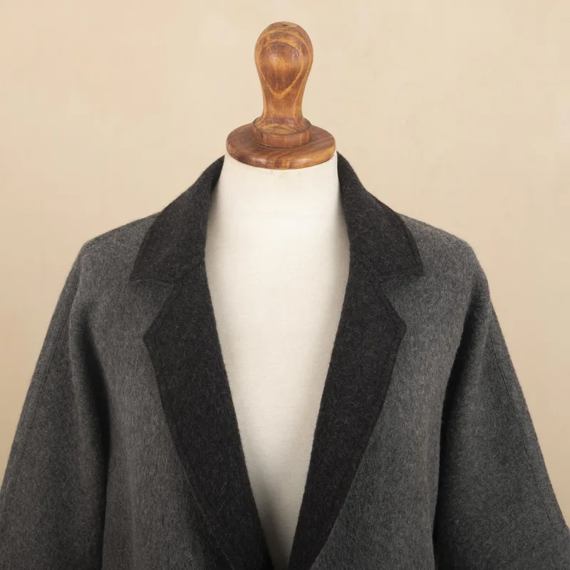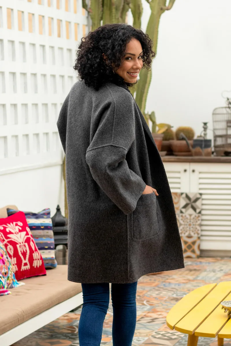 Luis Enrique Gonzales creates this soft and very warm kimono-style coat of cozy baby alpaca and wool. Reversible for versatility, its classic lines are complemented with a sophisticated color combination of charcoal grey with black trim, and lighter grey trimmed in black. Easy fit dropped shoulders, long wide sleeves and front pockets take this design everywhere all winter long.