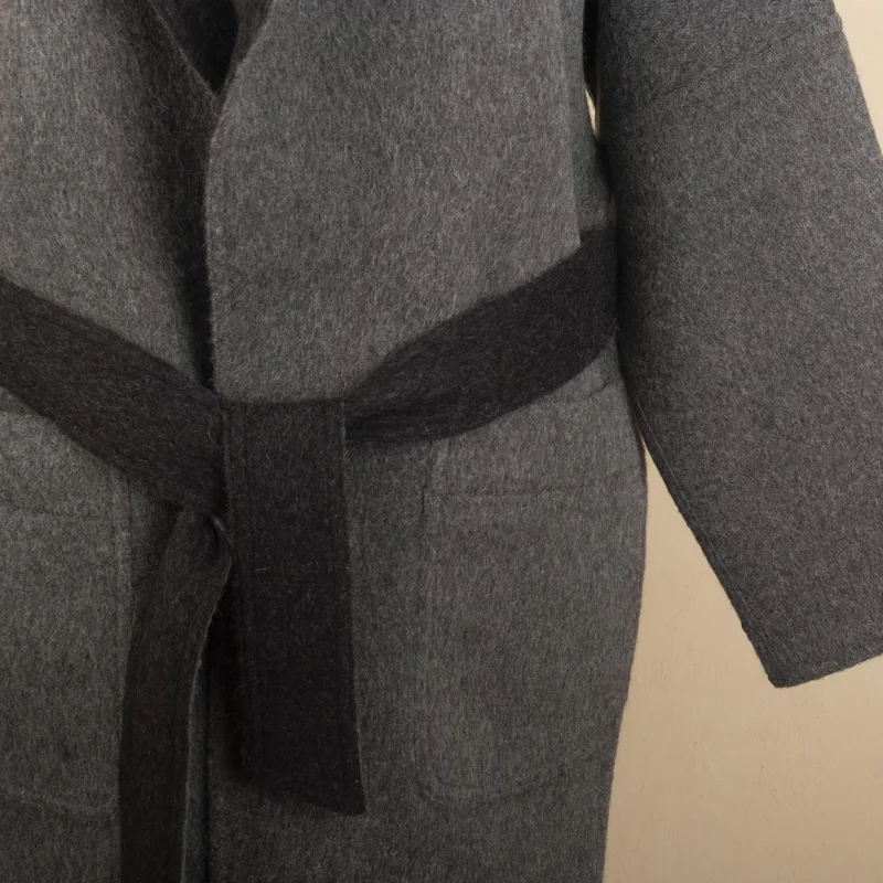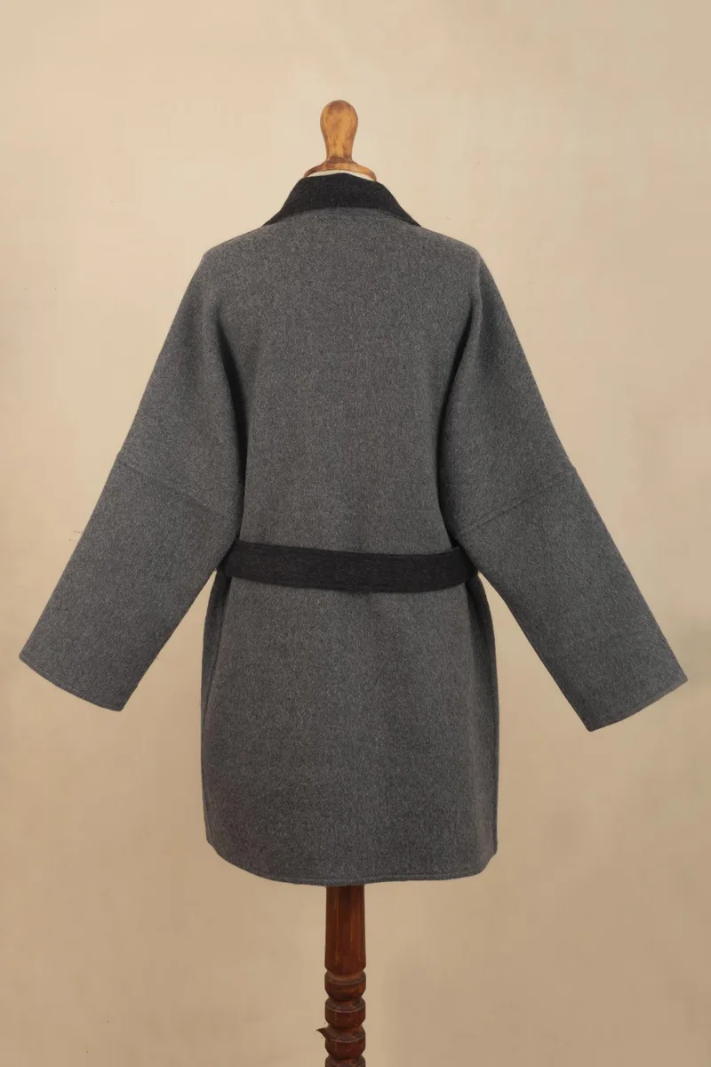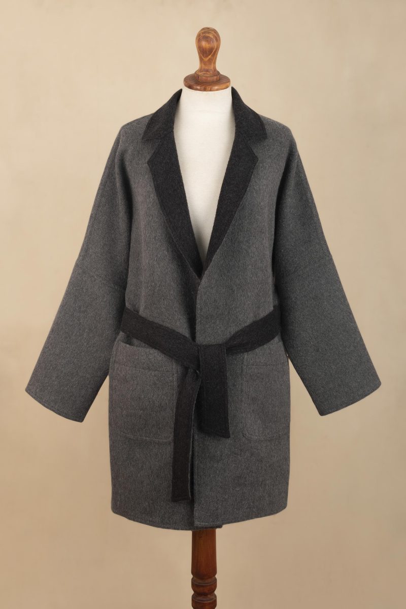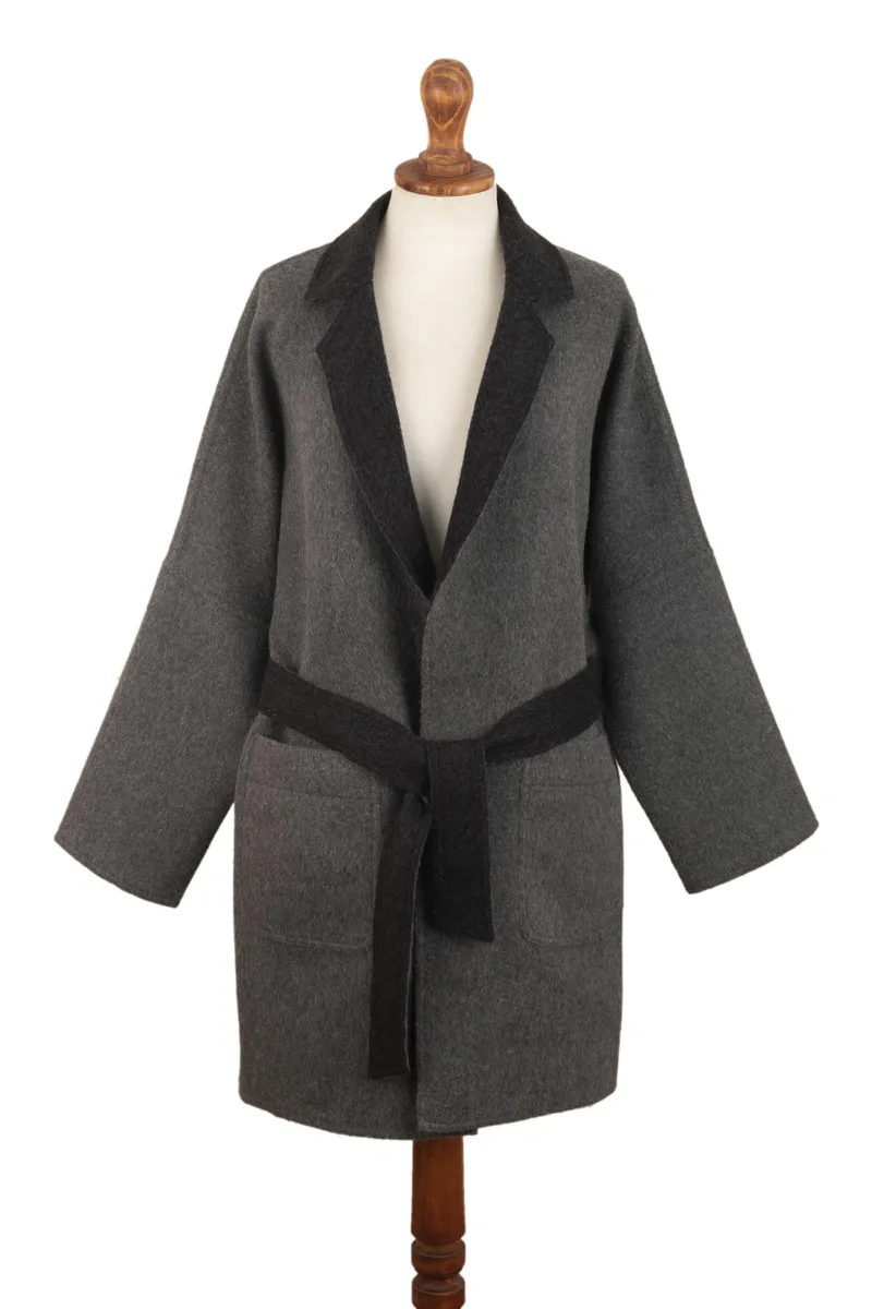 Luis Enrique Gonzales creates this soft and very warm kimono-style coat of cozy baby alpaca and wool. Reversible for versatility, its classic lines are complemented with a sophisticated color combination of charcoal grey with black trim, and lighter grey trimmed in black. Easy fit dropped shoulders, long wide sleeves and front pockets take this design everywhere all winter long.