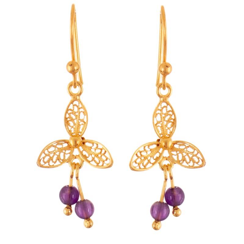 You can find our gold-plated amethyst filigree dangle earrings 'Purple Lotus Flower' by Alfredo Inga in jewelry categories such as Floral Earrings, Gemstone Earrings, Birthstone Earrings, Amethyst Earrings and Gold Earrings. Enjoy exploring these sections for other Novica treasures.