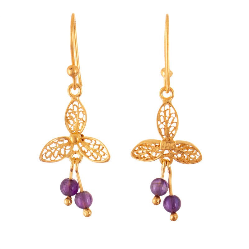 Lotus flowers inspire Peru's Alfredo Inga to create a fabulous pair of gold-plated dangle earrings that simply take your breath away. They are adorned with exquisite amethyst beads that elegantly sway from a delicate filigree design, mimicking the graceful movements of the lotus petals. With meticulous craftsmanship, each petal is expertly shaped to achieve the lace-like beauty that characterizes the revered artistry of this jewelry. Their gleaming finish adds a touch of refinement and infuses them with elegance and sophistication.